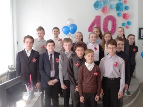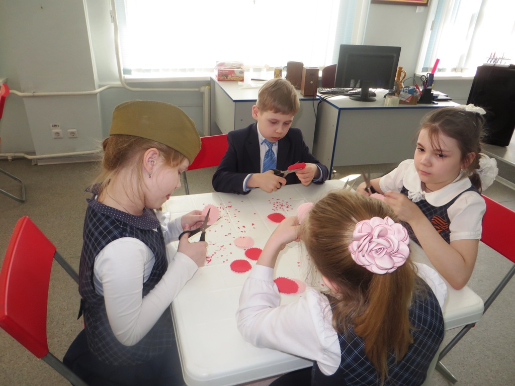 В завершении часа истории школьники приняли участие в мастер-классе «Красная гвоздика». Из фоамирана (пластичная замша) они сделали красно-розовые гвоздики и в знак уважения, памяти и солидарности с солдатами и героями Великой Отечественной войны прикрепили их на георгиевские ленты.