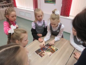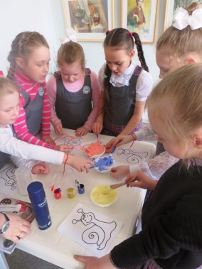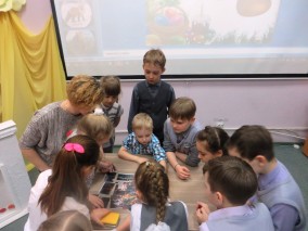 Собирая фрагменты картин Михаила Шанько "Пасха" и Татьяны Харитоновой "Освящение куличей", дети совершали увлекательное и познавательное путешествие по залам библиотеки. Побывали в гостях у "Алхимика", сделали объёмные краски и разукрасили ими маленьких улиток, а также поиграли в традиционные пасхальные игры «эстафета с яйцом» и «собери пасхальные яйца». По окончании квеста команды собрали из найденных фрагментов картины.