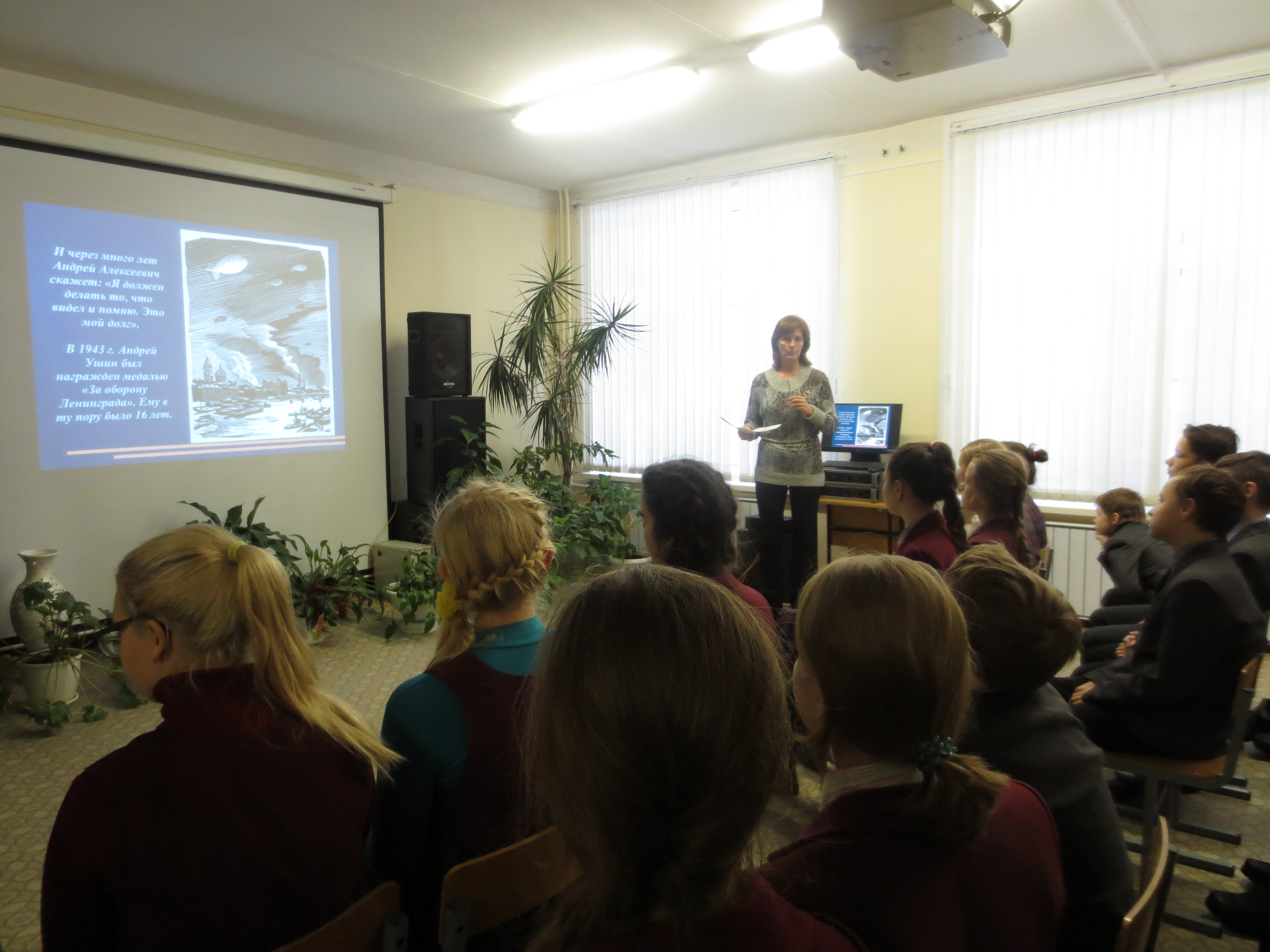 В преддверии 73 годовщины со Дня Победы в Великой Отечественной войне 7 мая состоялась встреча со школьниками, на которой им была показана презентация о художниках блокадного Ленинграда. Мероприятие проводилось с целью воспитать и формировать у детей чувство патриотизма, ответственности и долга, любовь к Родине и её истории.