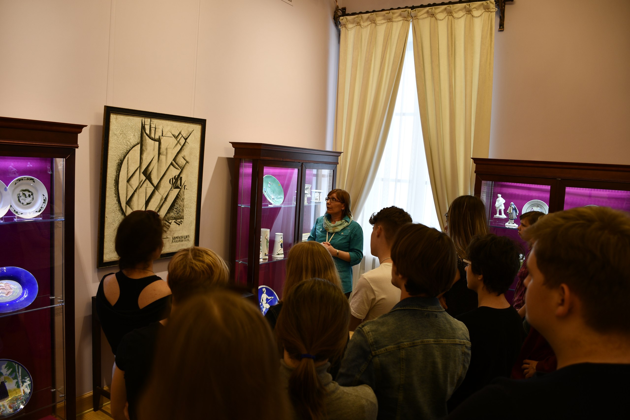 Учащиеся посетили залы Дворца и виртуальный филиал Русского музея, где их познакомили с творчеством художников русского авангарда. Сотрудниками виртуального филиала был продемонстрирован фильм "Русский Авангард. Роман с революцией". А после просмотра фильма ребятам в залах Тверской картинной галереи была проведена лекция об авангарде в русском искусстве.
