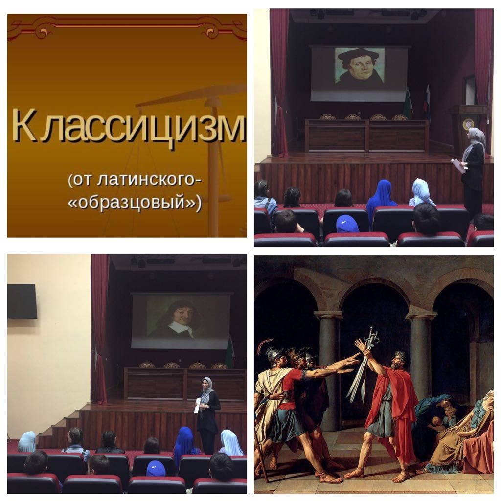 Старший научный сотрудник Муминат Турлаева рассказала ученикам о стиле " классицизм", подробнее ознакомив с отличительными особенностями стиля и его представителями: Ж. Л. Давид, Р. Декард, Н. Пуссен и др.