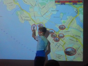 Жил да был трамвай В Выборге когда-то. Рано утром часов в пять Ехал от куда-то. Как из улья разлетались Желтые вагоны, По проспектам проезжали С шумом и со звоном.В мультимедийном кинотеатре виртуального филиала Русского музея в Выборге ребята путешествовали по интерактивной карте. Маленькие вагоновожатые звонили в колокольчик, отгадывали загадки и отправлялись в прошлое. Побывали ребята в Выборгском замке 18 века, увидели, как выглядел Выборгский вокзал в разные годы, искали места, где в Выборге водятся медведи и лось, узнали, где была Баранья тюрьма, смотрели репродукции картин с изображением старого Выборга и отправились на виртуальную прогулку по парку "Монрепо".