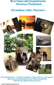 13 июня в Досуговом центре Муниципального округа МО 65 Приморского района Санкт-Петербурга на Туристской улице, дом 30, корпус 1 состоялось открытие выставки фотохудожника Натальи Петровой «Я люблю тебя, Россия!» Выставка приурочена ко Дню России и рассказывает о нашей стране и её людях.