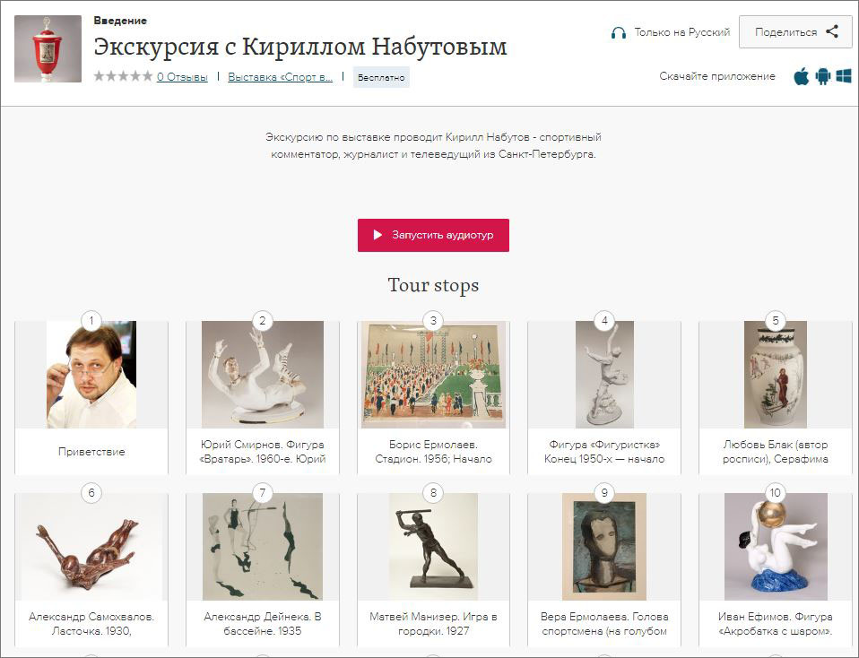 Русский музей совместно с сервисом мобильных гидов izi.travel запустил специальный проект к выставке «Спорт в советском фарфоре, графике, скульптуре», которая демонстрируется в корпусе Бенуа до 30 июля.