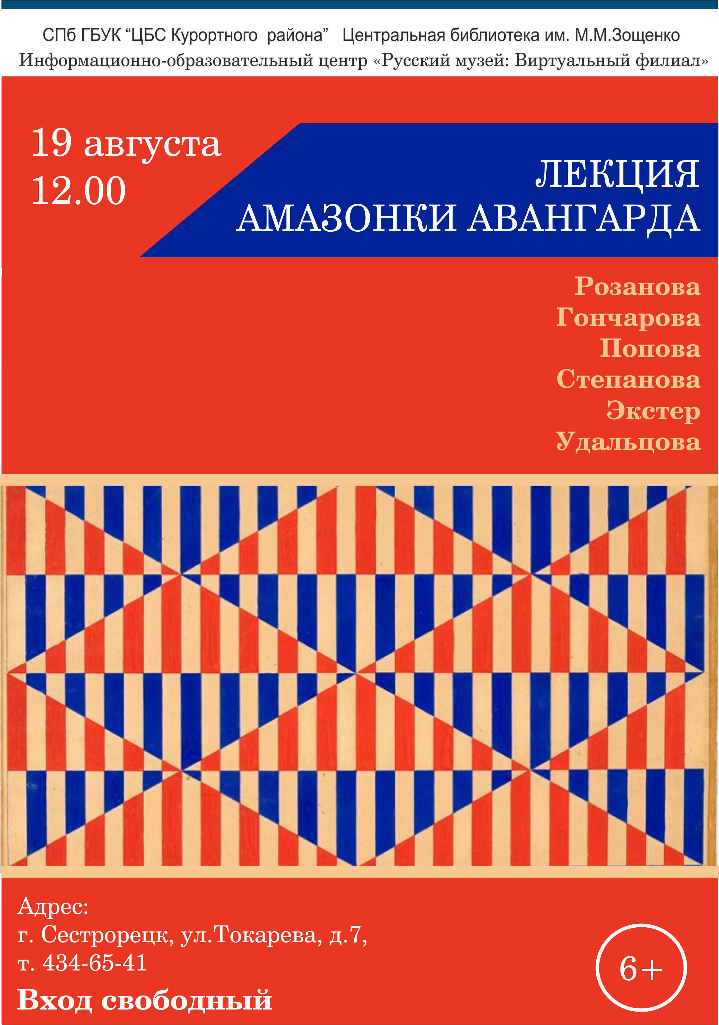 19 августа 2018 года в 12.00 в Центральной библиотеке им. М.М. Зощенко прошла лекция "Амазонки Авангарда: Розанова, Гончарова, Попова, Степанова, Экстер, Удальцова".