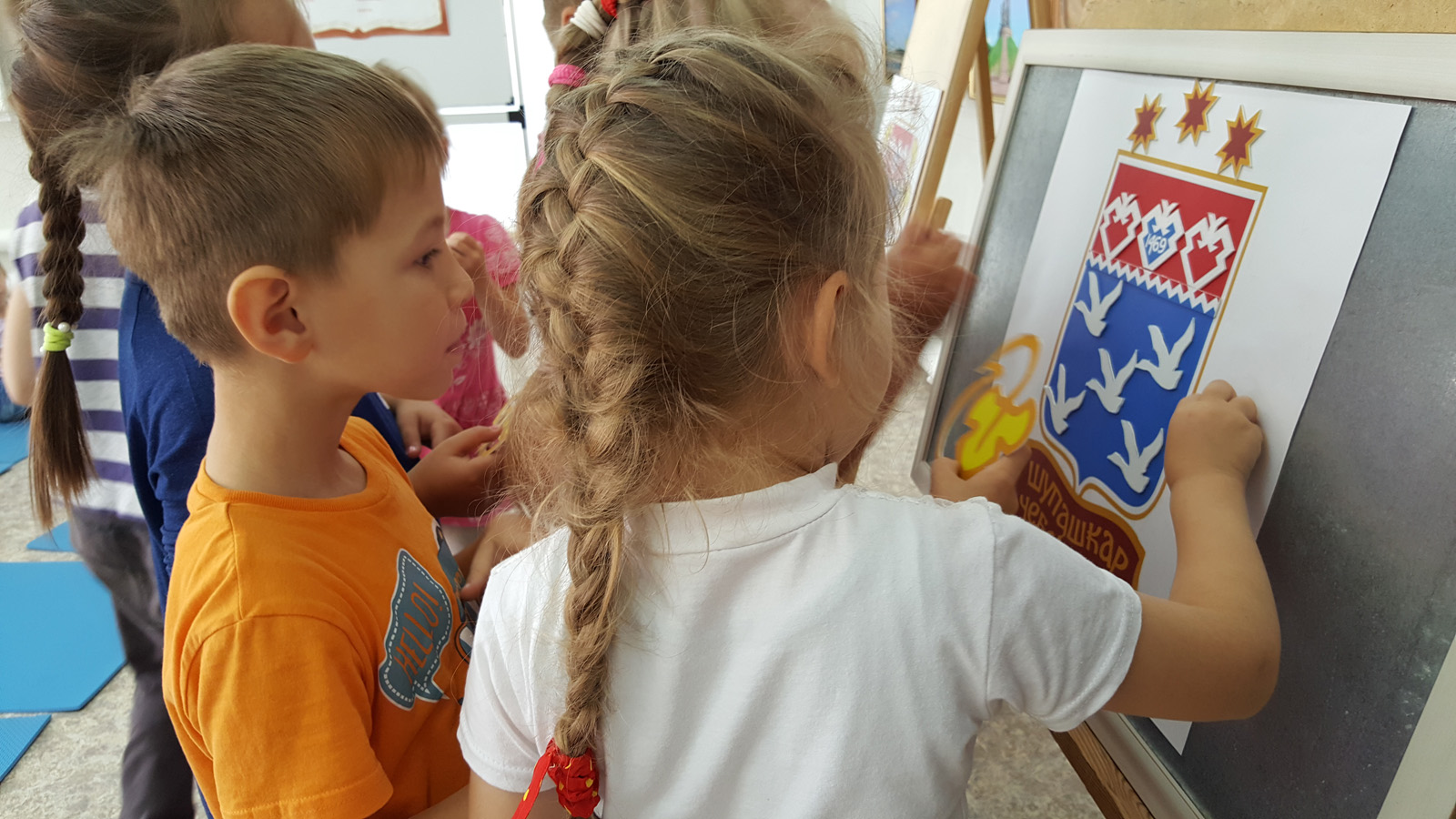 Дошкольники тщательно исследовали символику столичного герба и безошибочно собрали его из составляющих элементов методического пособия.