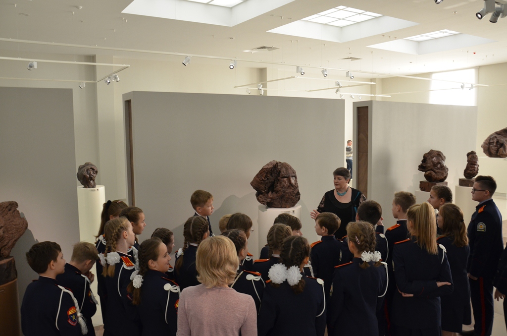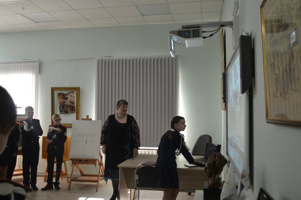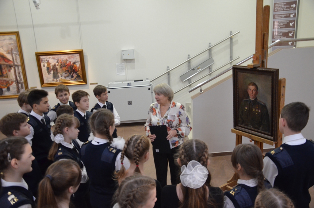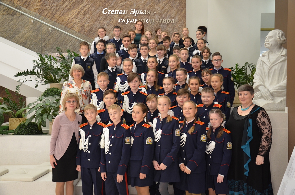 Второй год Музей Эрьзи принимает участие во Всероссийской акции «День в музее для российских кадет», цель которой заключается в формировании у подрастающего поколения уважительного отношения к российской культуре. Сотрудники отдела музейной педагогики разработали интерактивное занятие "Славные защитники Отечества" и пригласили в музей кадет из школ №3 и №30. В ходе экскурсии ребята услышали рассказ о героях разных лет, защищавших Россию от врагов, увидели шедевры нашего собрания, раскрывающие данную тему. У картины В.Е. Артамонова "На дорогах войны" девочкам-кадетам было предложено оживить сюжет и перенестись в годы Великой Отечественной войны, на фронтах которой наряду с мужчинами воевали и женщины, порою совсем ещё юные.