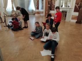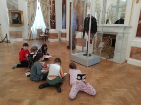 В эту субботу детям продемонстрировали фильм "Ты пришел в музей" из обширной медиатеки Русского музея. Посмотрев его, ребята больше узнали о Михайловском дворце и коллекции, которая хранится в его стенах. После просмотра они отправились в залы Парадной анфилады Тверского императорского дворца, где смогли сделать зарисовки экспонатов, представленных на выставке "Из истории государства Российского..." из ГМЗ "Царское село" и частного собрания семьи Карисаловых. Таким образом, дети познакомились с коллекцией трёх музеев.