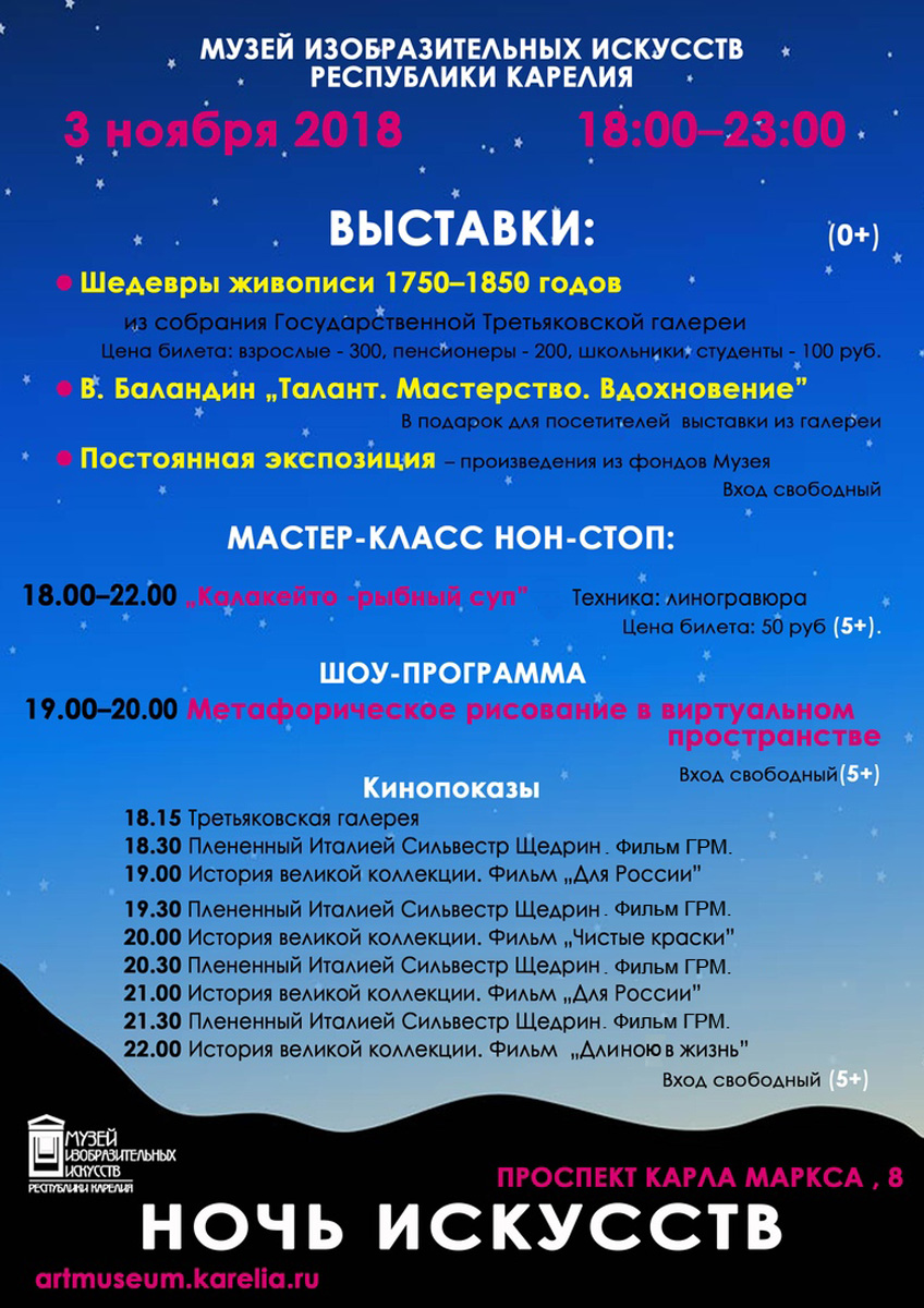 Слоган «Ночи искусств — 2018» — «Искусство объединяет». Для культурных учреждений всей страны это прекрасная возможность по-новому взглянуть на свои коллекции, заявить о себе, попасть в популярные афиши, привлечь еще больше постоянных посетителей. Библиотеки и дома культуры, маленькие и большие музеи, музыкальные школы и консерватории, галереи и концертные залы, арт-пространства и театры, площадки мегаполисов и сел — все будут открывать искусство для зрителя. Искусство объединяет: это общая ценность для людей с разными вкусами и разными представлениями о жизни, для детей и взрослых, для знатоков и тех, кто только начинает свой путь. В «Ночь искусств» все становятся единомышленниками: совсем скоро это докажут сотни культурных учреждений по всей стране и тысячи их посетителей. Музей изобразительных искусств Республики Карелия присоединяется к акции «Ночи искусств — 2018» и подготовил разнообразную программу: