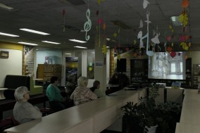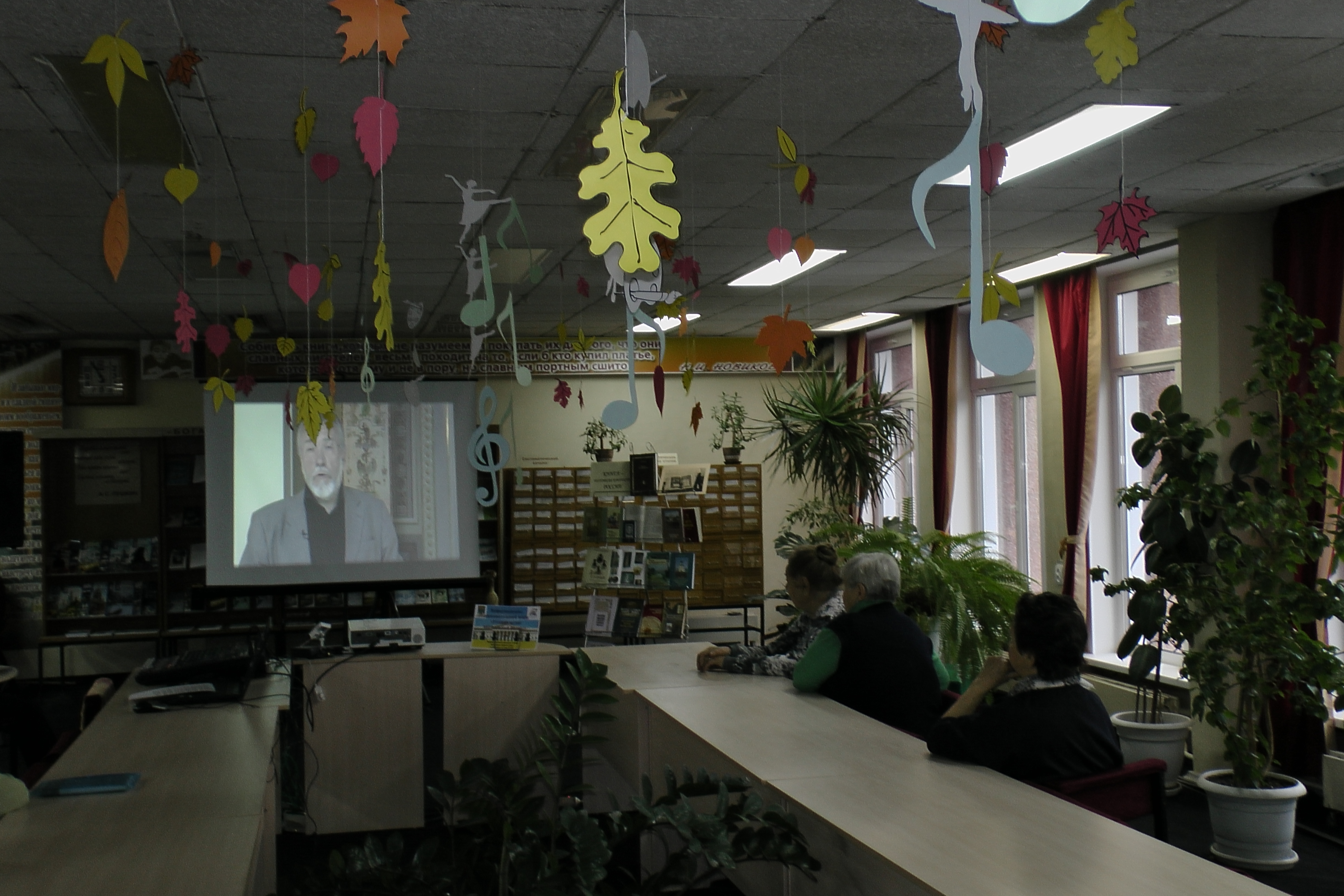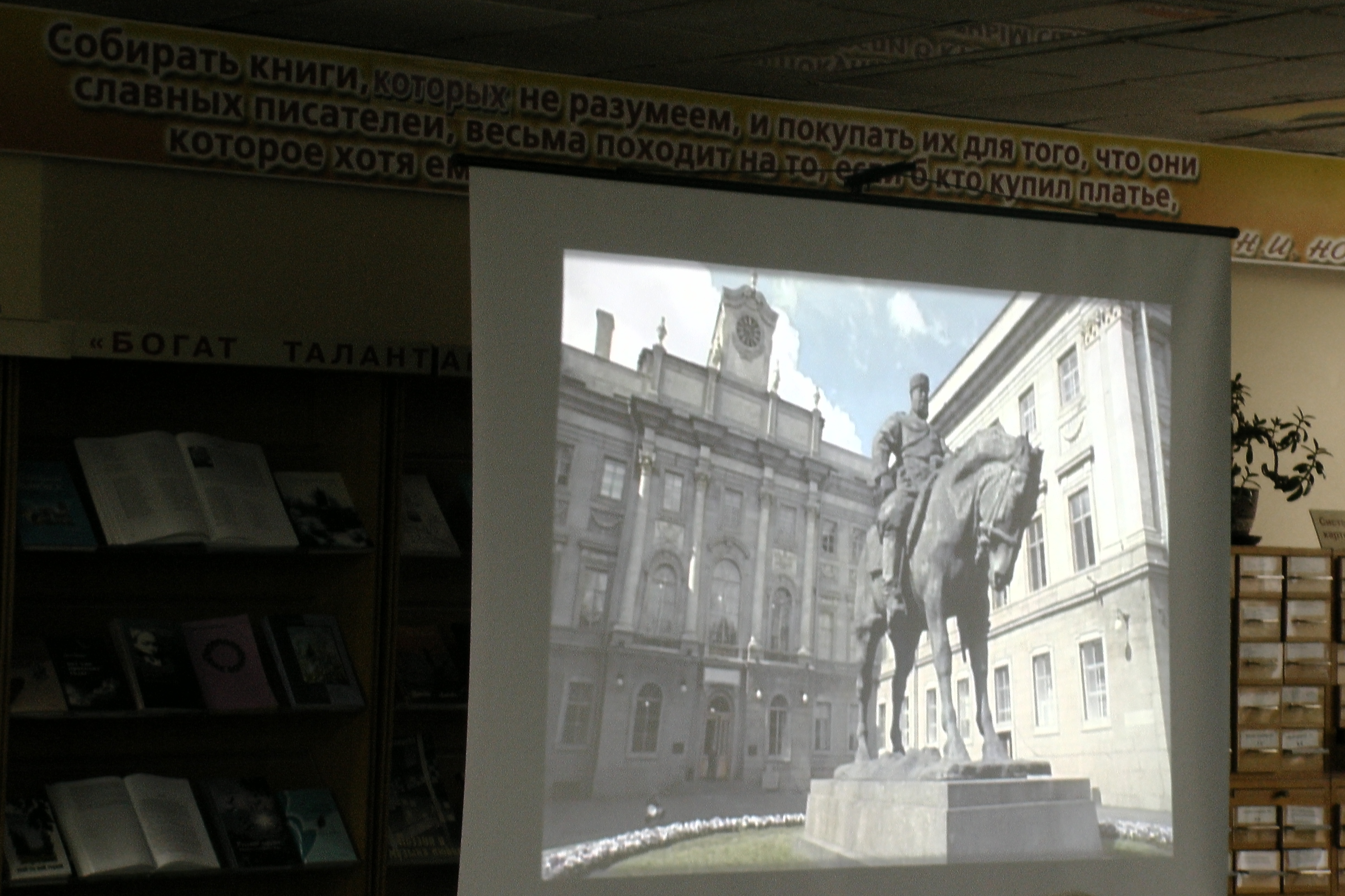 Парадная лестница, живописные плафоны, частично сохраненный Мраморный зал, барельефы с воинскими доспехами, аллегорические скульптуры и многое другое смогли увидеть гости читального зала на большом экране.