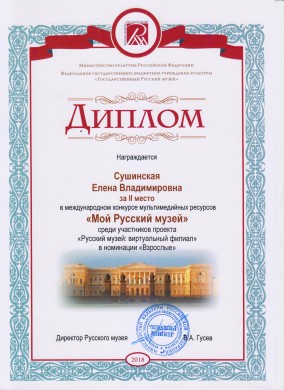Диплом за II место в номинации «Взрослые» получила коллективная работа, представленная на конкурс информационно-образовательным центром «Русский музей: виртуальный филиал», действующим на базе Центральной районной библиотеки им.  В.Г. Белинского Санкт-Петербургского Государственного бюджетного учреждения культуры «Централизованная библиотечная система Калининского района».