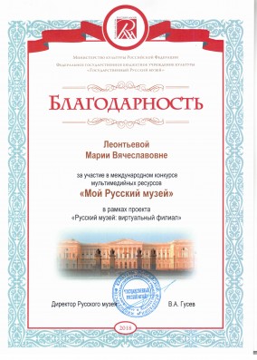 Благодарность за участие в конкурсе в качестве руководителя проекта-победителя получила руководитель информационно-образовательного центра «Русский музей: виртуальный филиал» на базе ЦРБ им. В.Г. Белинского заместитель директора СПб ГБУК «ЦБС Калининского района» Леонтьева М.В.