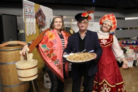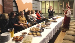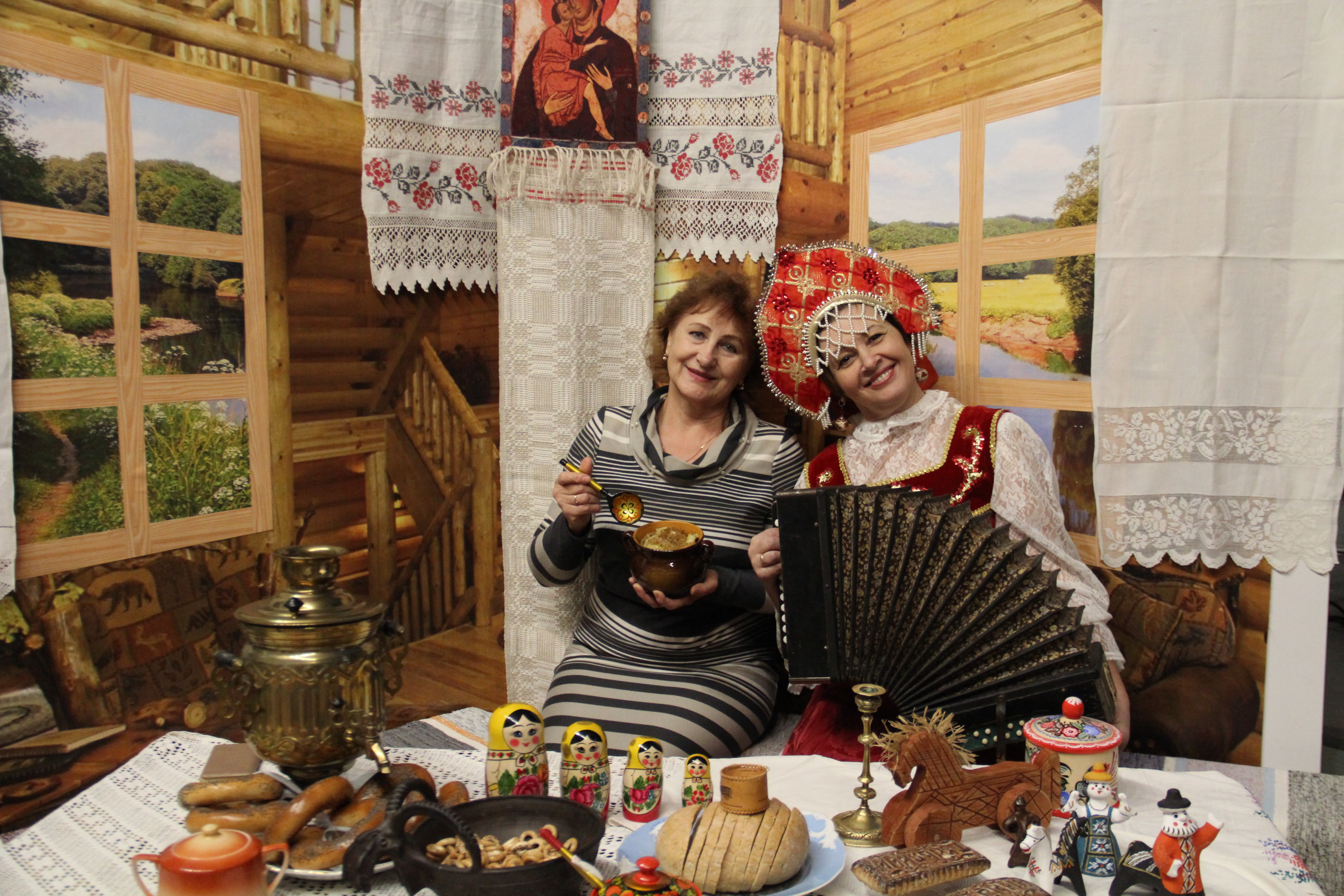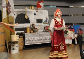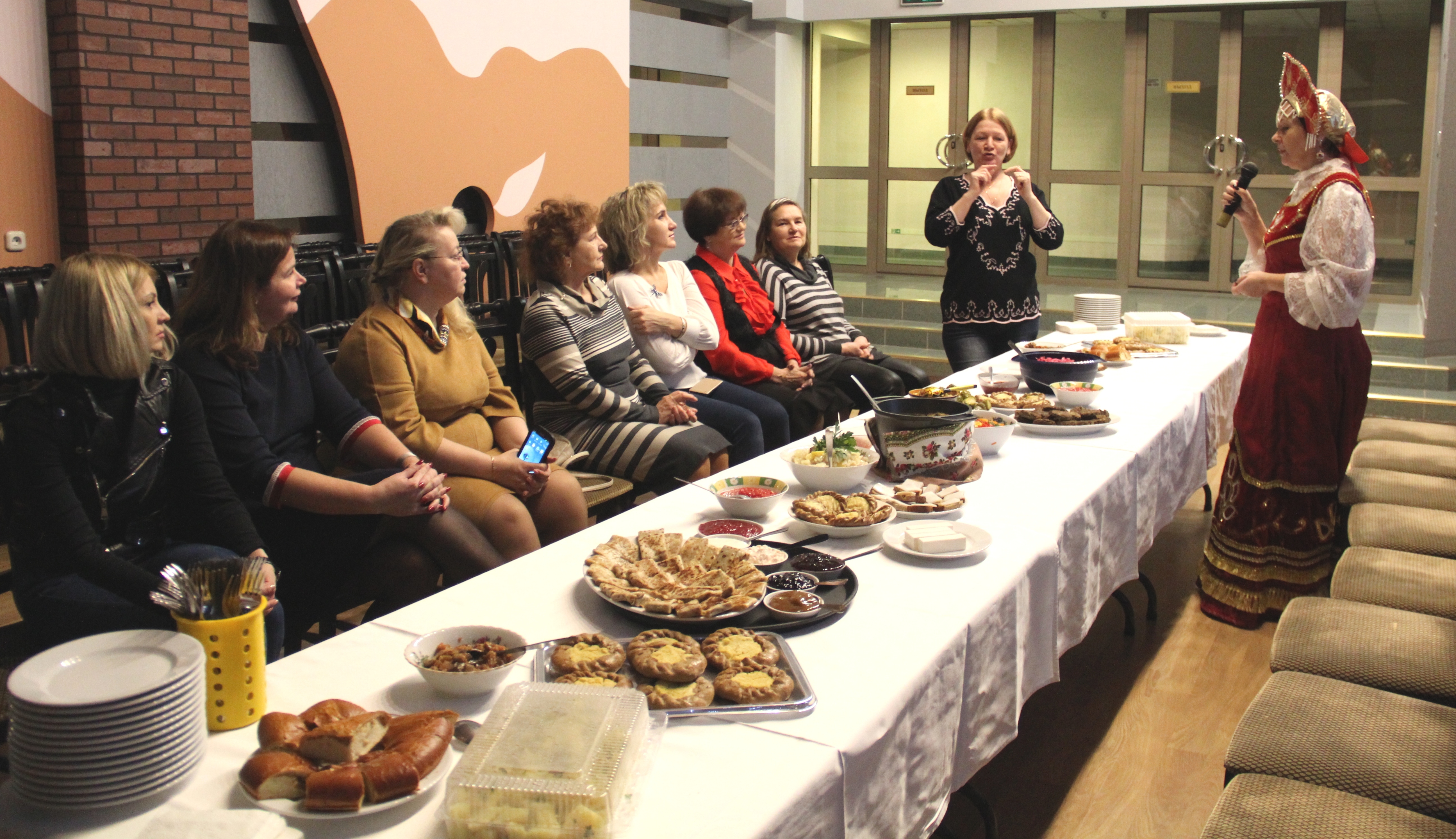 Более подробно рассказали о предметах повседневного быта русской крестьянки: ложках, посуде, ухватах и прочих, необходимых вещей. Наши коллеги тоже постарались; они приготовили блюда русской национальной кухни. С удовольствием представили их и провели дегустацию. В фото зоне, организованной нами, сотрудники виртуально смогли оказаться в русской избе.
