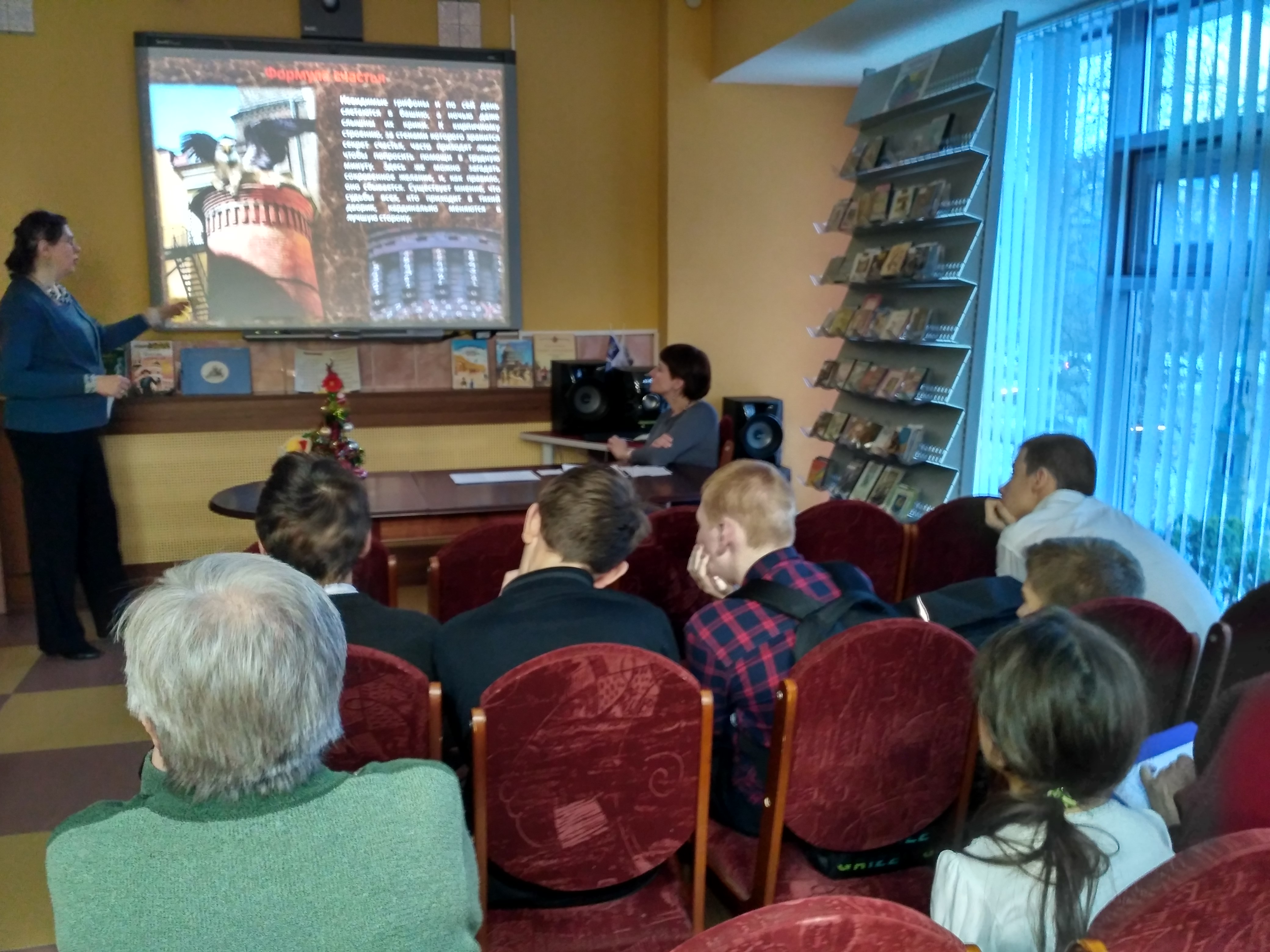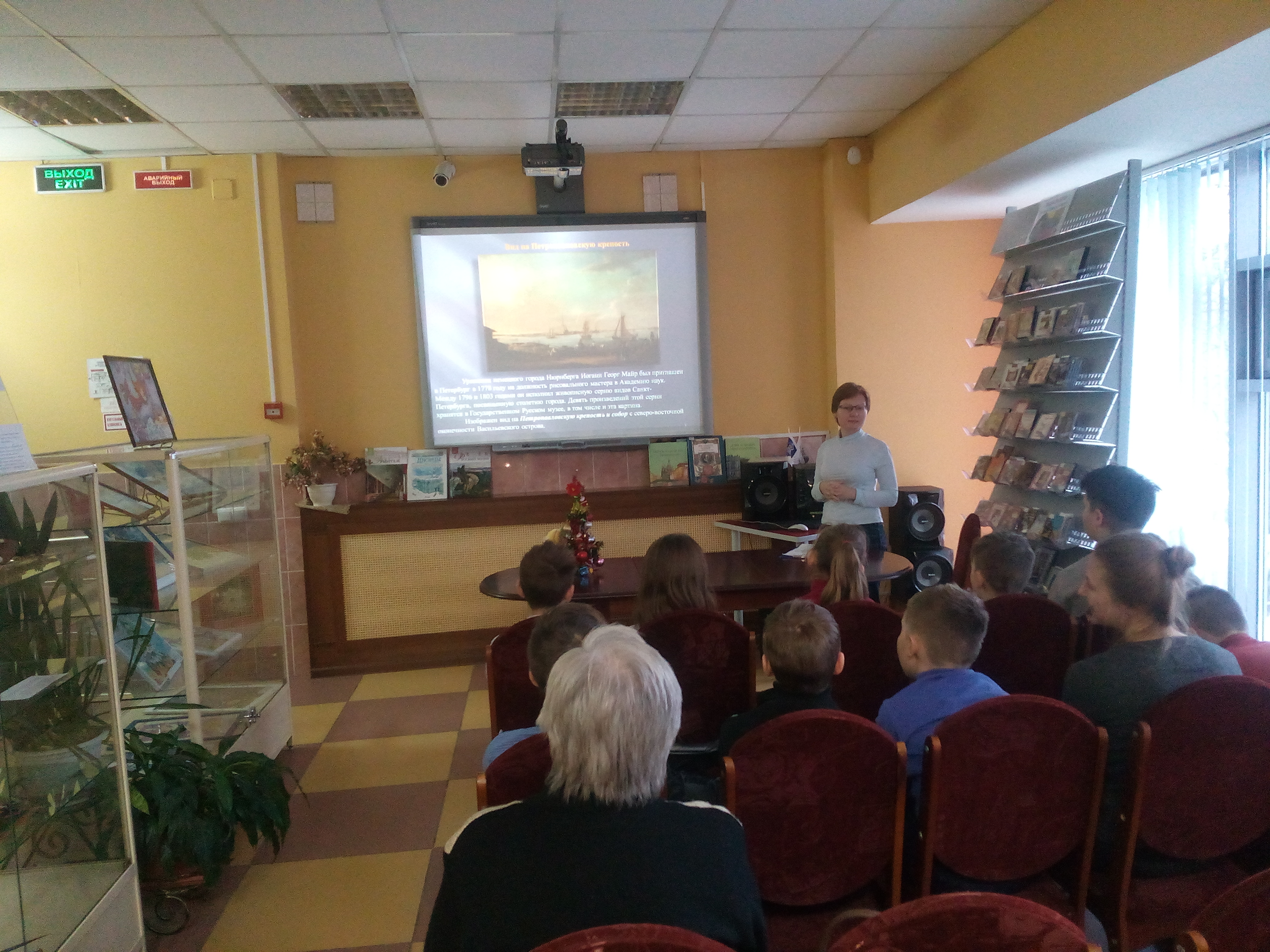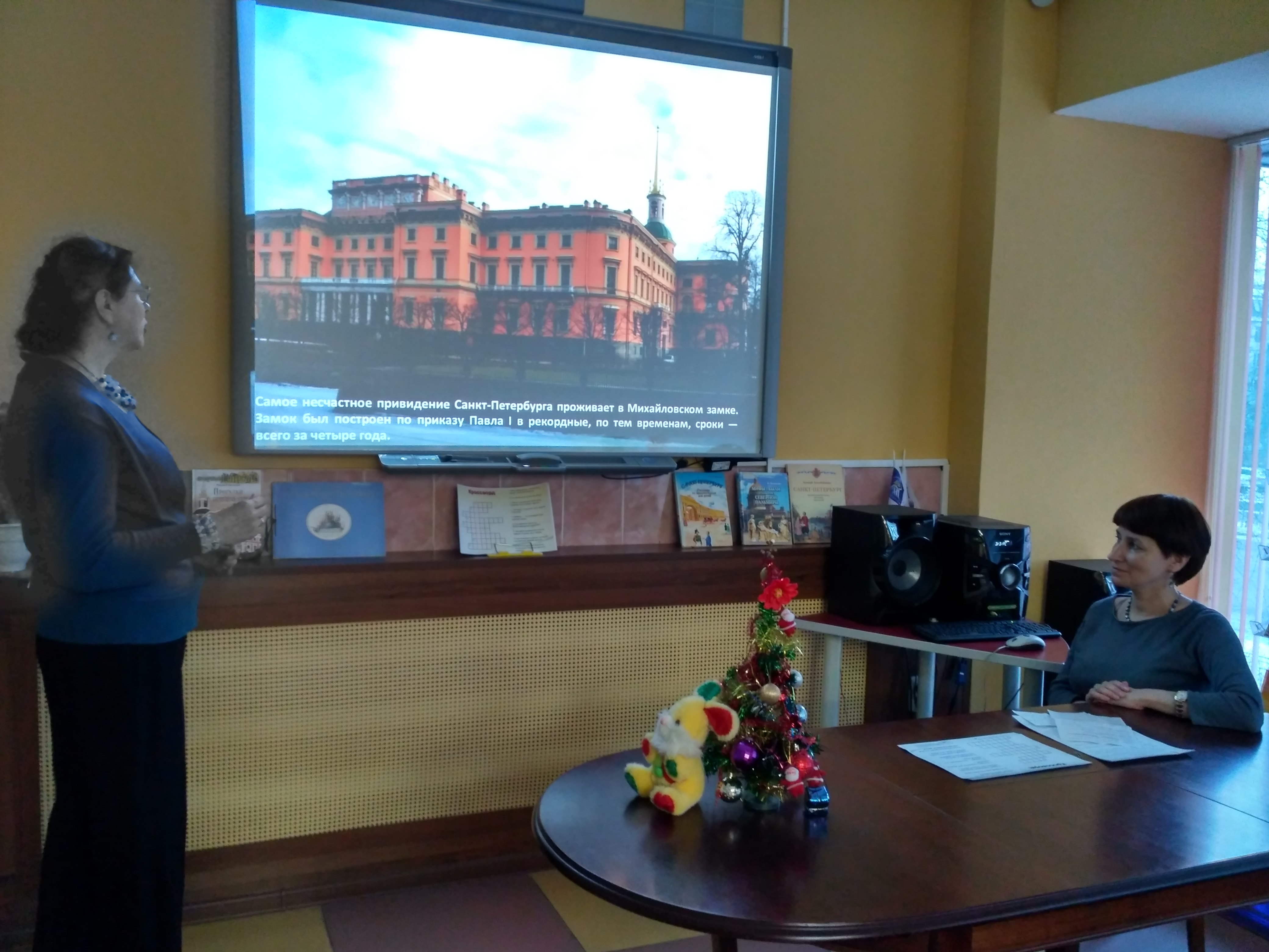 18 декабря сотрудник зала искусства Нинель Олеговна Агеева и сотрудник медиазала Ирина Геннадьевна Яцук провели беседу «Легенды Санкт-Петербурга» для учащихся 6 класса школы №13. Школьники совершили виртуальное путешествие, во время которого услышали множество легенд, связанных с архитектурными памятниками нашего города – Медным всадником, Башней грифонов, ангелом на шпиле Петропавловского собора и др. Наиболее таинственным и мистическим местом предстал перед зрителями Михайловский замок с его не менее загадочным владельцем - императором Павлом первым. О судьбе правителя и его дворца ребята узнали благодаря фильму из Медиатеки Русского музея «Архитектурный автопортрет Павла I».