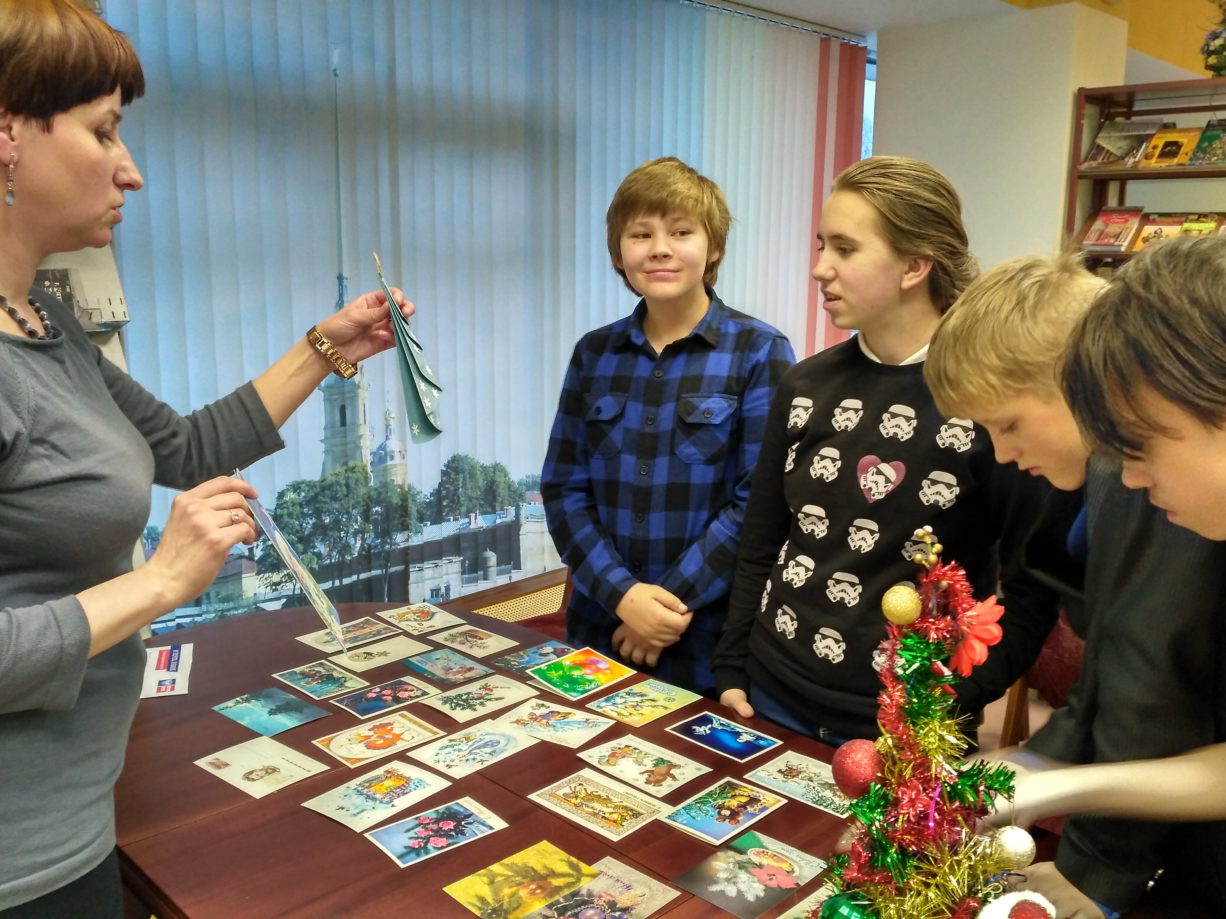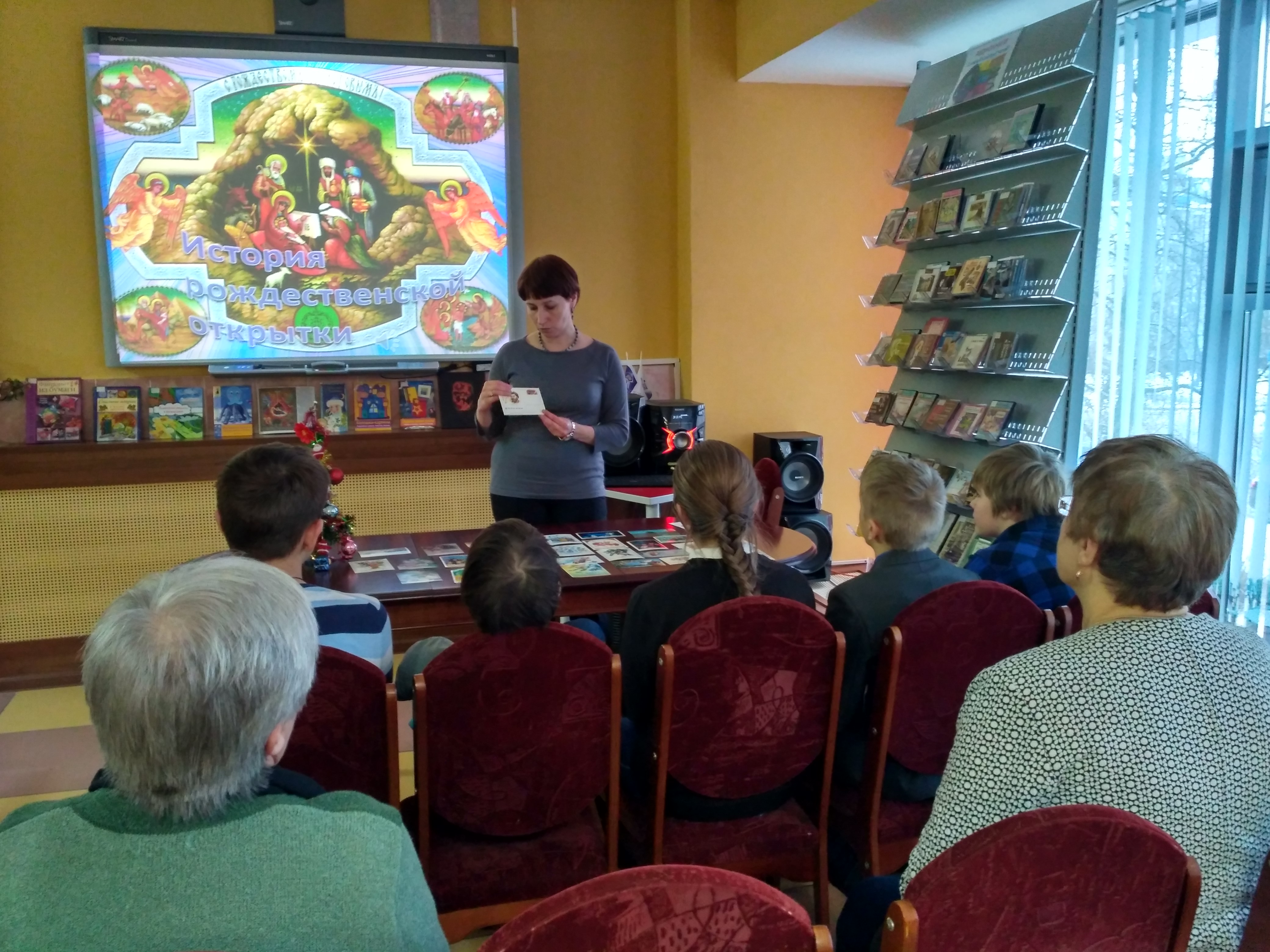 17 и 19 декабря библиотеку посетили ученики младших классов ГБОУ школы №106 и №13. Библиотекарь зала искусства Нинель Олеговна Агеева провела беседу «История рождественской открытки», в ходе которой учащиеся узнали историю празднования Рождества Христова. Также говорилось о создании и распространении первой рождественской открытки, об особенностях русского стиля, созданного художниками миниатюрного жанра. Особое внимание было уделено работам такого автора, например, как Владимир Иванович Зарубин.
