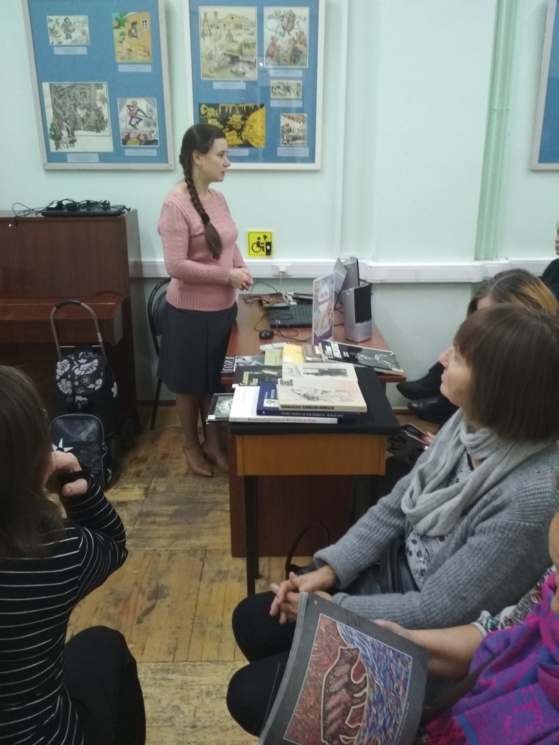 Слушателям курса «Искусствоведение для лиц третьего возраста» были предложены видеоматериалы из числа разработанных сотрудниками ГРМ на тему «Гравюра». Различные техники гравирования, материалы и инструменты, особенности технологического процесса раскрыты в учебных видеофильмах на примере работ А. А. Остроумовой-Лебедевой, П. А. Шиллинговского, В. А. Фаворского, В. Д. Фалилеева, А. Ф. Зубова, М. И. Махаева, Д. И. Митрохина, В. А. Серова, И. И. Шишкина, Ю. А. Васнецова, В. В. Лебедева, Е. И. Чарушина. По итогам занятия было принято решение посетить мастерскую графики института культуры и искусства СГУ им. Питирима Сорокина, поскольку появилось большое количество вопросов, ответы на которые не дали ни авторы фильма, ни лектор, ни авторы изданий из фондов отдела литературы по искусству НБ РК. У слушателей возникла потребность ознакомиться с процессом создания гравюры непосредственно.