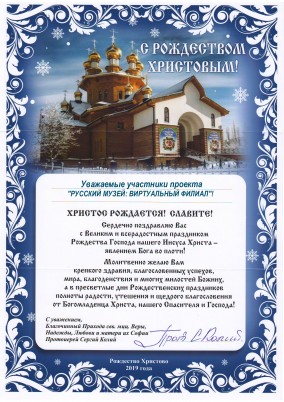 Дорогие друзья! Поздравляем вас с наступающим Новым годом и Рождеством Христовым! Пусть этот год принесет мир и согласие, радость и благополучие! Пусть крепкими будут ваши семьи! Счастьем, теплом и уютом наполнены ваши дома, а сердца - любовью родных и близких. С праздником!