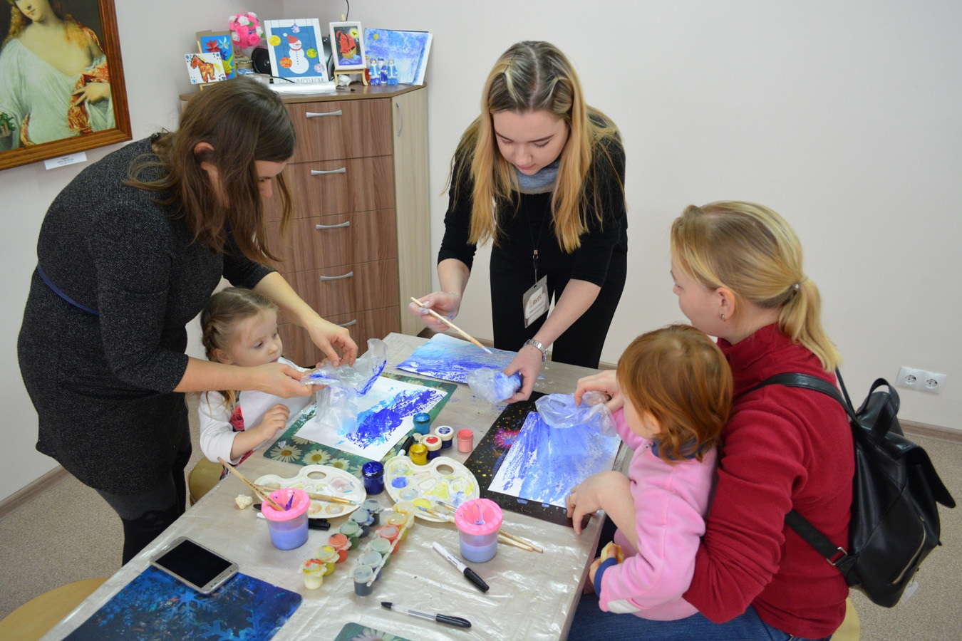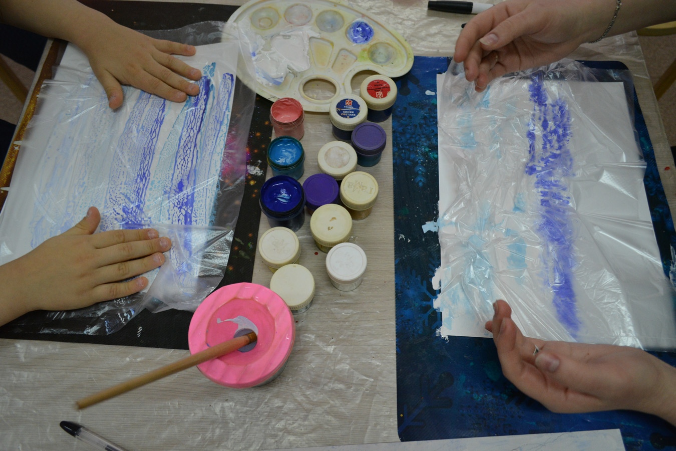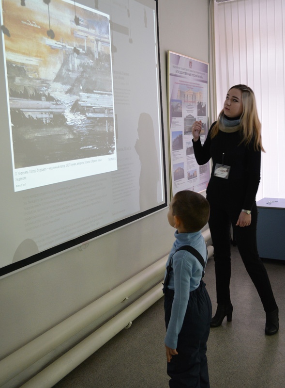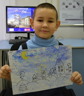 В компьютерном классе Виртуального филиала Русского музея ребята собрали пазл картины «Беспредметная композиция №88 (66)» Александра Родченко, еще одного последователя супрематизма. Вдохновившись необычными работами художников, творческой мастерской авангарда ребята придумывали свои сказочные города, в которых царит зимнее волшебство. И детям, и взрослым понравилась нетрадиционная техника нанесения краски с использованием целлофанового пакета, и кто-то решил создавать подобные пейзажи и дома.