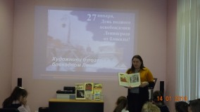 В кинозале виртуального филиала Русского музея состоялся просмотр фильма «Художники блокадного Ленинграда в собрании Русского музея» из цикла «Век Русского музея» В. А. ГусеваПосле просмотра фильма прошла беседа о Русском музее и его продолжавших работу сотрудниках в эти годы. Читателям были показаны на экране живописные и графические работы советских художников (А. Пахомов, С. Юдовин, С. Бойм). Беседу дополнил книжный обзор «Шедевры Русского музея» и книжная выставка "900 дней мужества". В ходе беседы в детях воспитывается гордость за свой город; уважение к людям, выдержавшим блокаду, нравственно - патриотические чувства. Школьники прослушали обзор книг о блокаде Ленинграда. Посетители смогли рассмотреть репродукции картин художников – жителей города, продолжавших свою работу в осажденном городе.