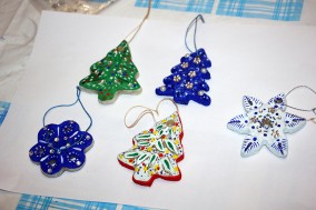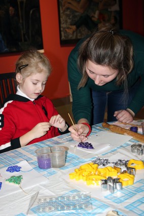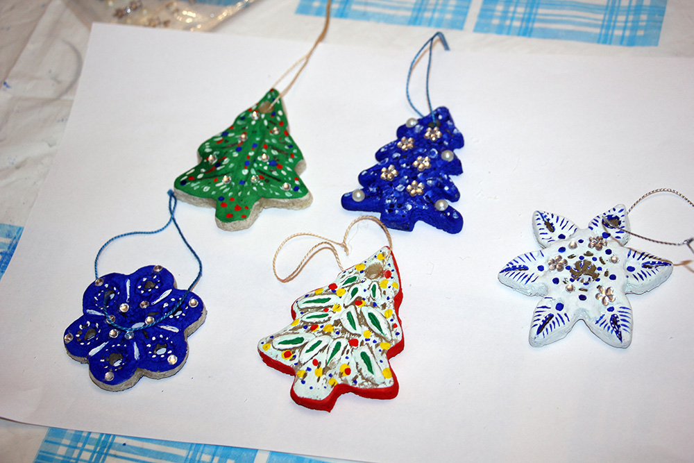 В завершение череды праздничных дней 7-8 января мы предложили мастер-класс, рассчитанный на самых маленьких посетителей – детей 5-7 лет. Это лепка из соленого теста и роспись различных предметов ёлочного декора. «Закружились» на столе перед детьми белые, голубые снежинки, украшенные бусинами и кристаллами, появились ёлки, вылепленные и расписанные ими самыми причудливыми узорами.