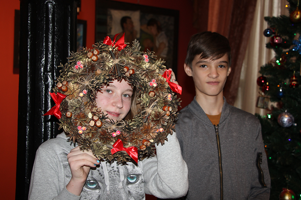 Первые посетители мастер-классов, пришедшие в музей – это ученики школы-интерната для детей, имеющих ограничения здоровья. Для своей работы они выбрали мелкие сосновые шишки, яркие ленты, золотую краску и сделали очень красивый, богато украшенный декоративными элементами рождественский венок, который можно разместить на двери, стене и украсить им свой интерьер.