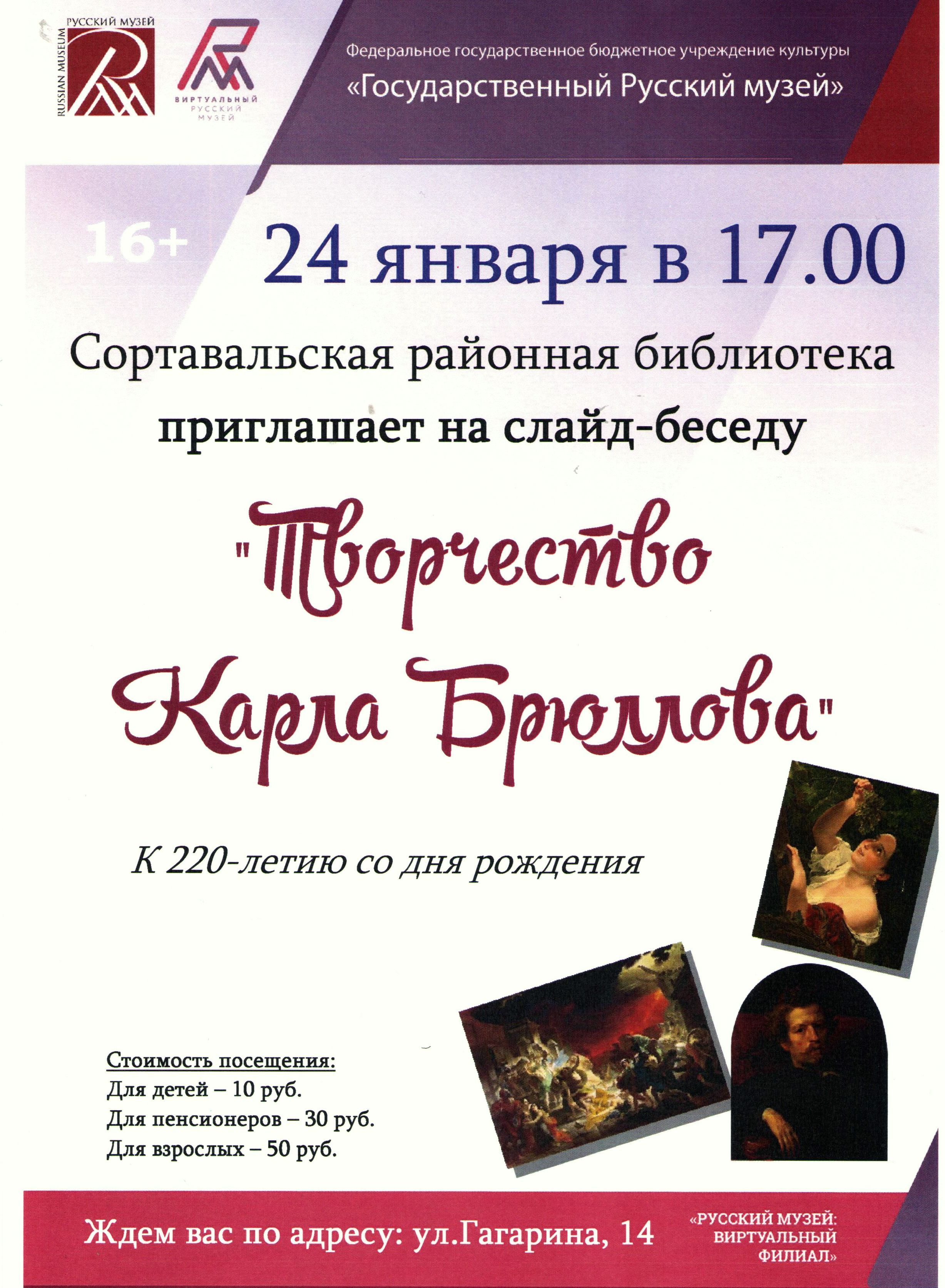 24 января в Сортавальской районной  библиотеке состоялась слайд-беседа «Творчество Карла Брюллова», посвященная 220-летию со дня рождения художника.