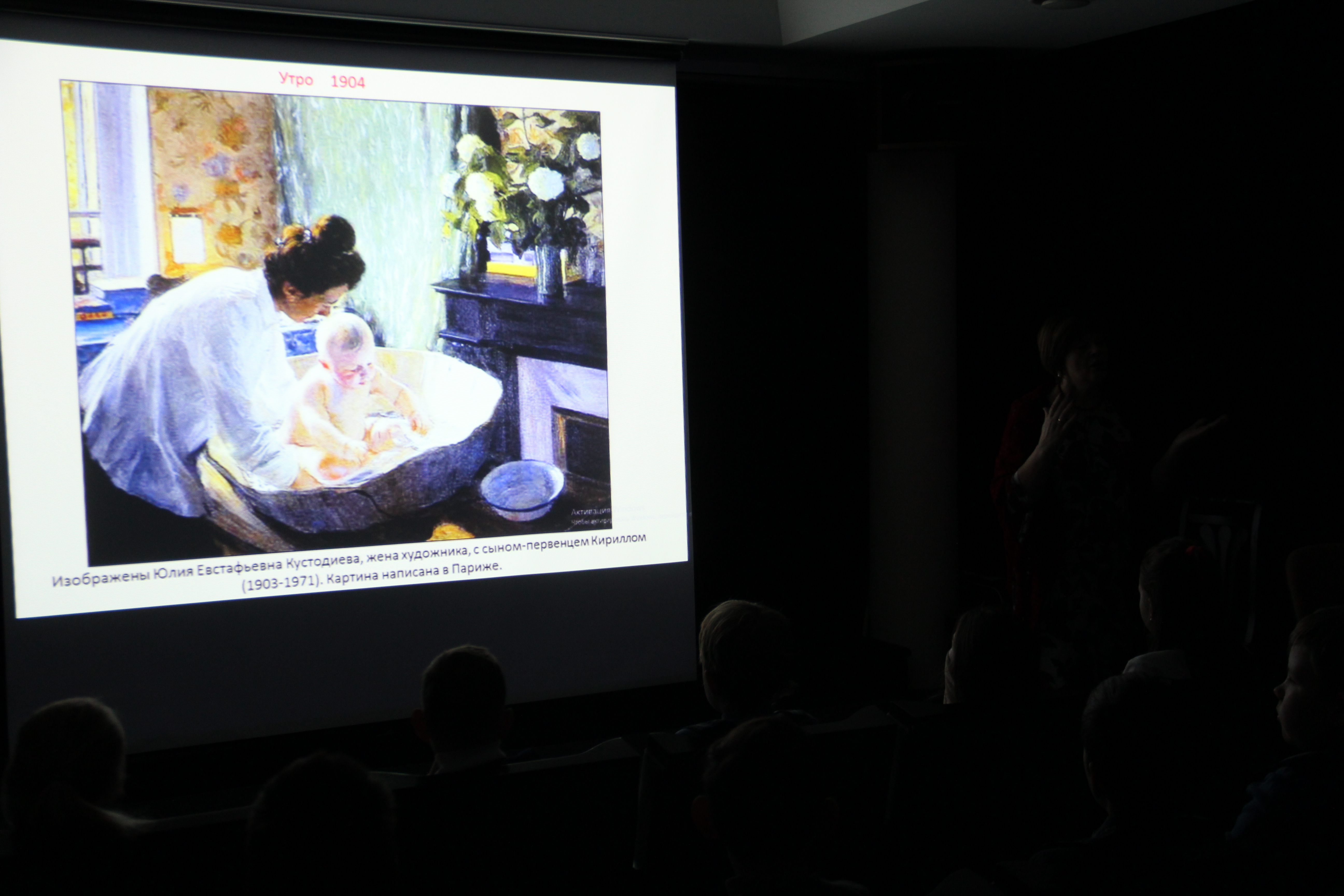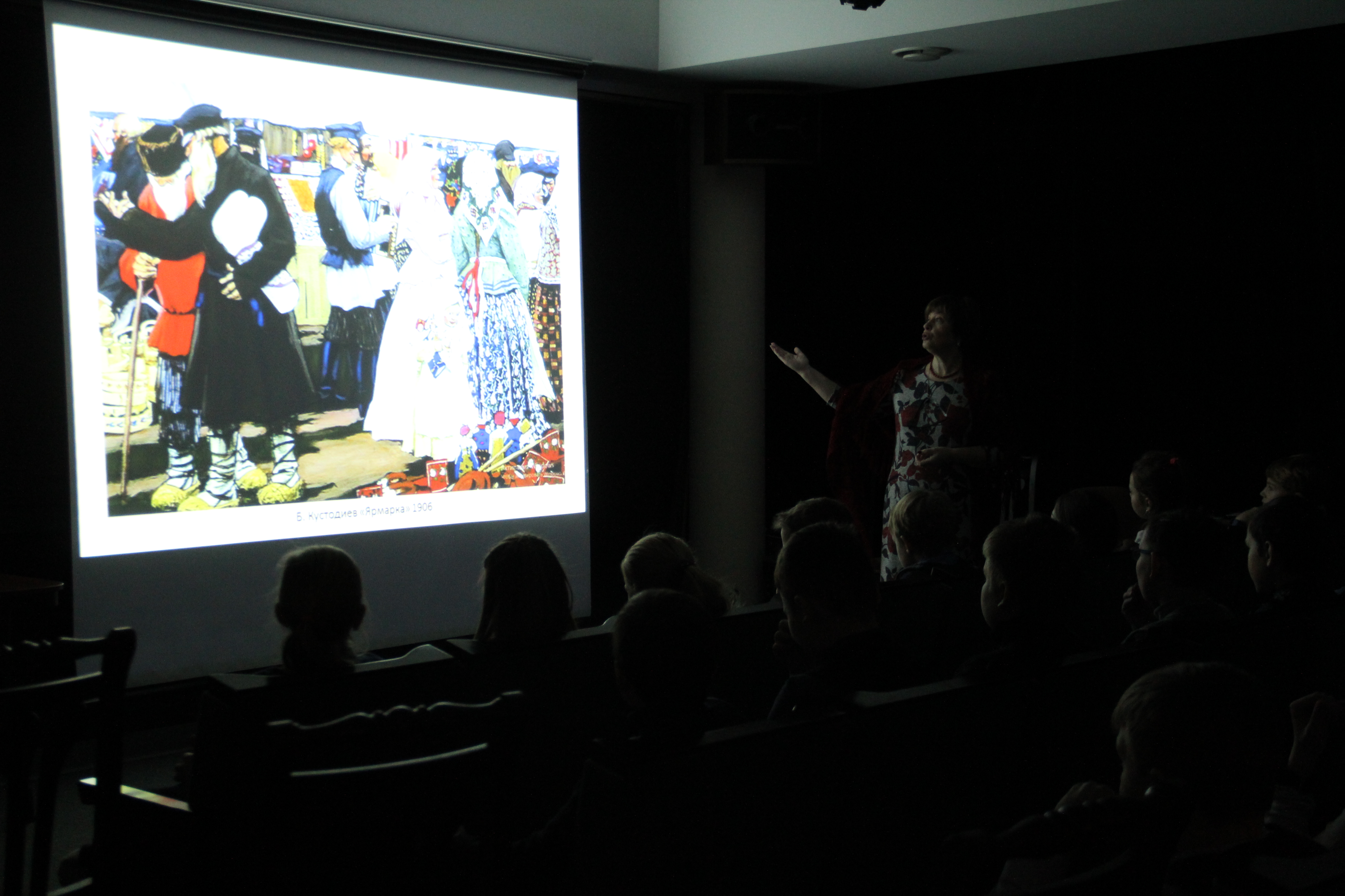 На нашей экскурсии было важно раскрыть секрет влюблённости в праздничную сторону народной жизни. В чём секрет такой влюблённости? Только ли в том, что по натуре был Кустодиев удивительно бодрым и жизнерадостным? Нет, конечно. Чтобы ответить на это, мы вернулись на много лет назад. Кустодиев, очарованный красотой всего русского национального, с жадностью вбирал виденное: богатые ярмарки, красочные балаганы, пёстрые глиняные игрушки, лубки, лапти. Праздничные русские обряды с их внешними атрибутами (костюмами, украшениями, игрушками), национальная самобытность – вот почва, на которой произрастало вдохновение Кустодиева-художника.