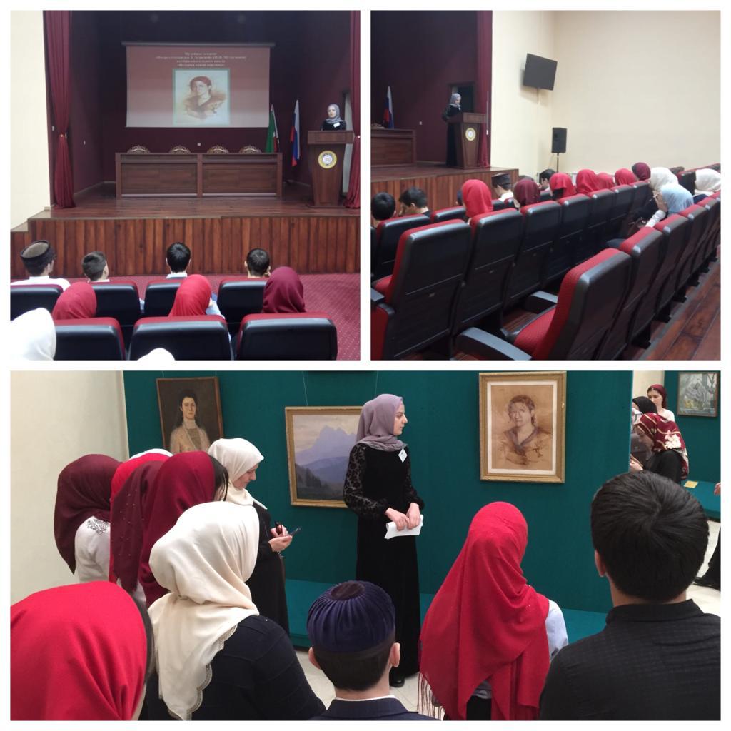 Лайла Дасаева рассказала ученикам о творчестве известного чеченского художника Ислама Ибрагимовича Мутусханова. Школьники ознакомились с историей создания картины «Портрет студентки З. Аушевой». Картина, написанная художником в 1996 году, находится в постоянной экспозиции Национального музея ЧР. В завершение музейного урока учащимся были заданы вопросы для закрепления материала