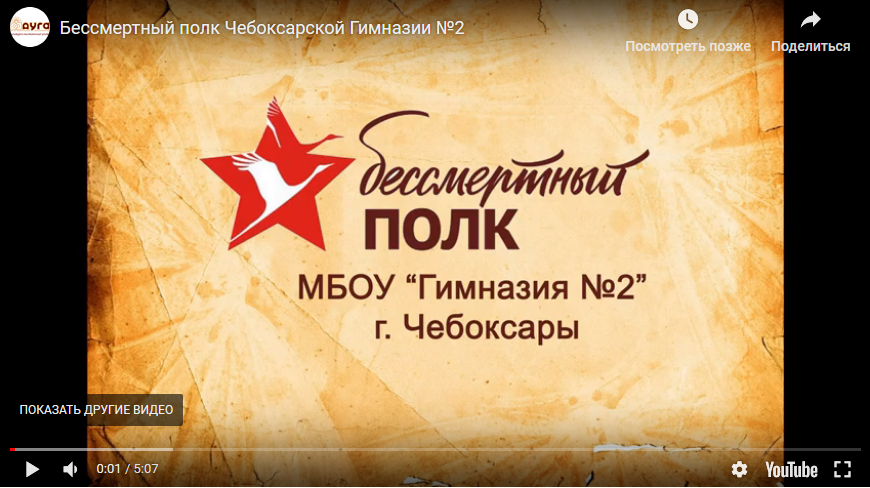 Связист, разведчик, морской пехотинец, танкист, минометчик, медсестра, ракетчик, артиллерист, труженица тыла – это лица из бессмертного полка Гимназии №2 г. Чебоксары. Данью уважения своим близким, памятью об их подвиге стало видеообращение на сайте «Моя семья в истории Великой Победы», созданное на основе фотоматериалов из семейных архивов обучающихся и преподавателей гимназии.