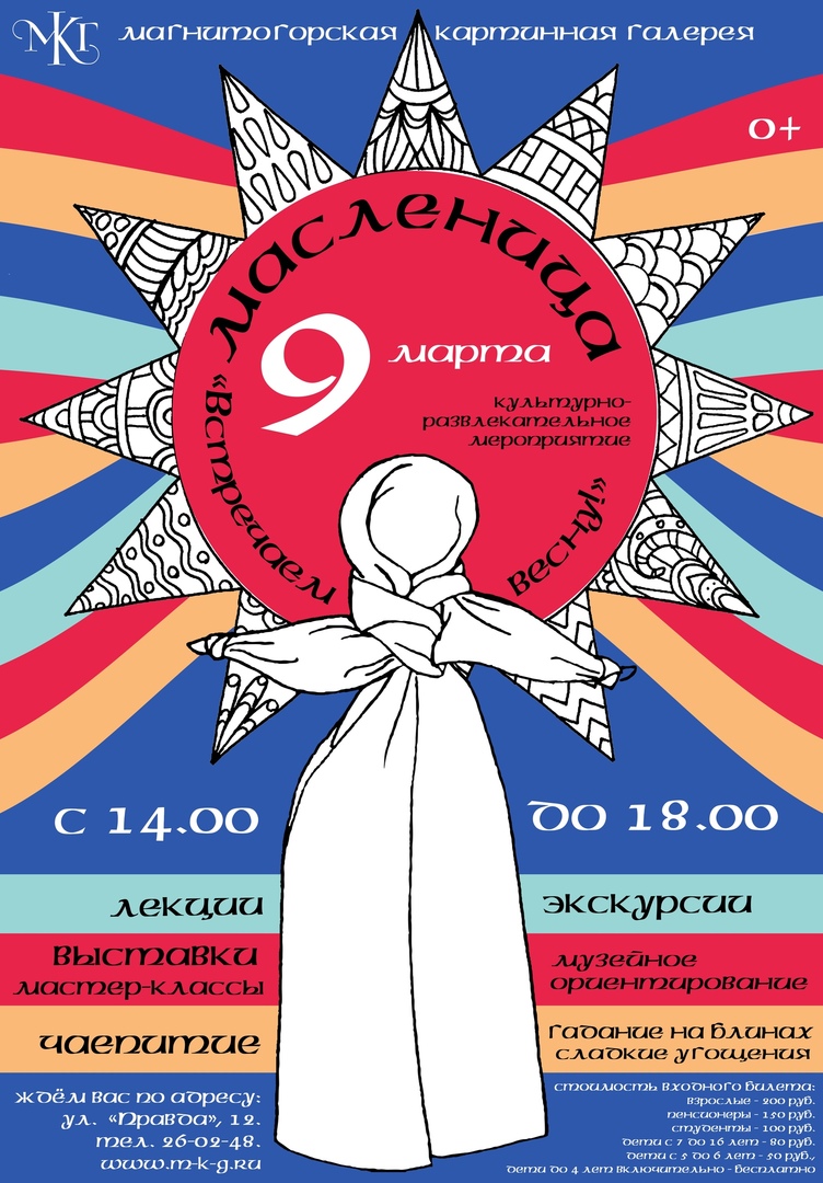 9 марта 2019 года в Магнитогорской картинной галерее прошло культурно-развлекательное мероприятие «Встречаем весну» в честь масленицы. Посетителей ожидала насыщенная программа: гадание на блинах, разнообразные мастер-классы, выставки, музейное ориентирование, лекции и экскурсии.