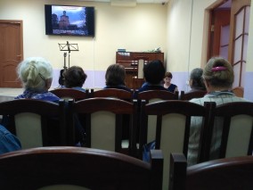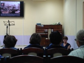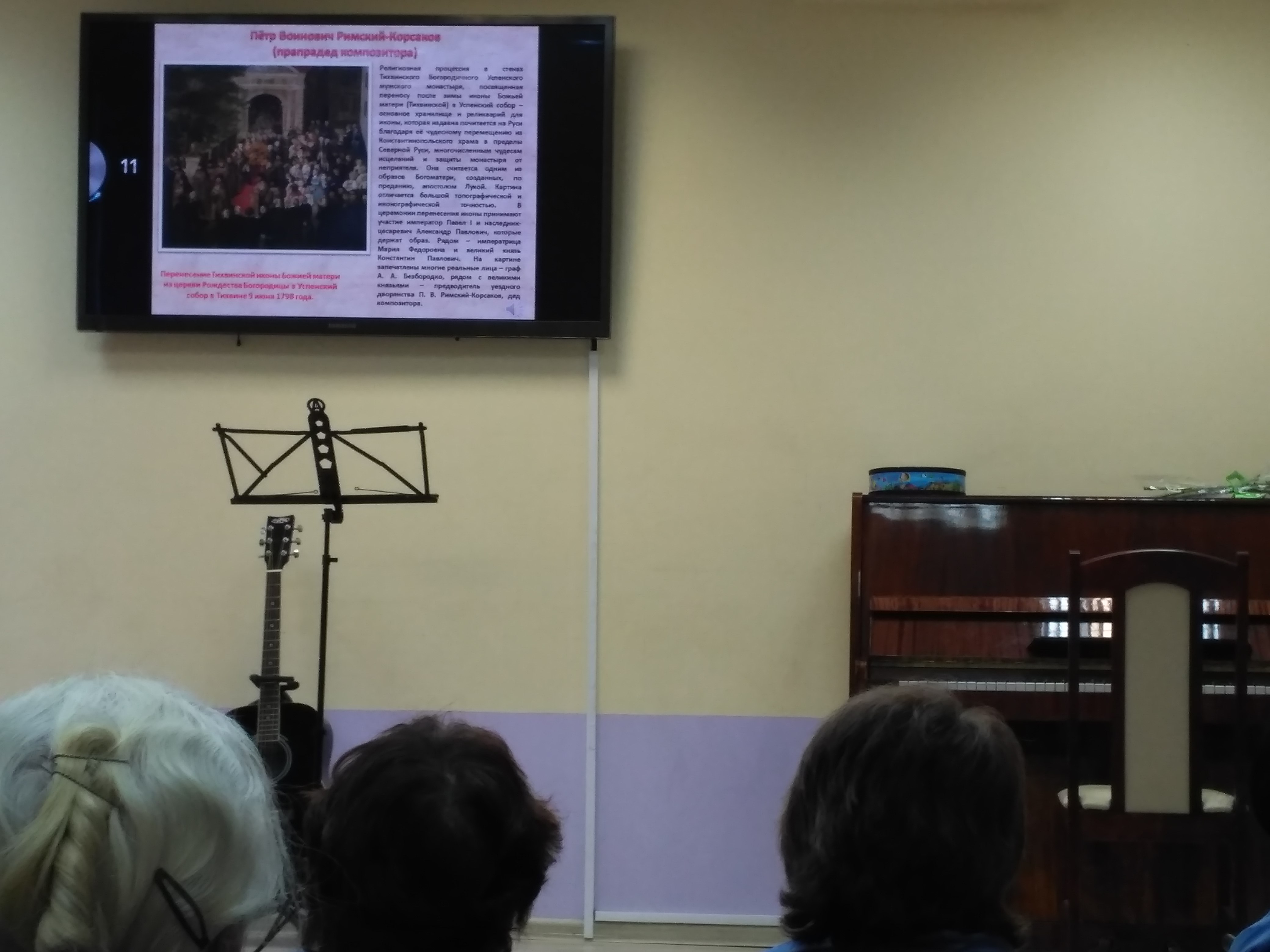 В первой части мероприятия библиотекарь зала искусства Нинель Олеговна Агеева рассказала о выдающемся русском композиторе, педагоге и дирижере Николае Андреевиче Римском-Корсакове и его предках, которые прославились своими заслугами перед Отечеством. При подготовке и проведении беседы использовались иллюстративные материалы портала «Виртуальный Русский музей», в том числе картина художника В.Истомина "Перенесение Тихвинской иконы Божией матери...".