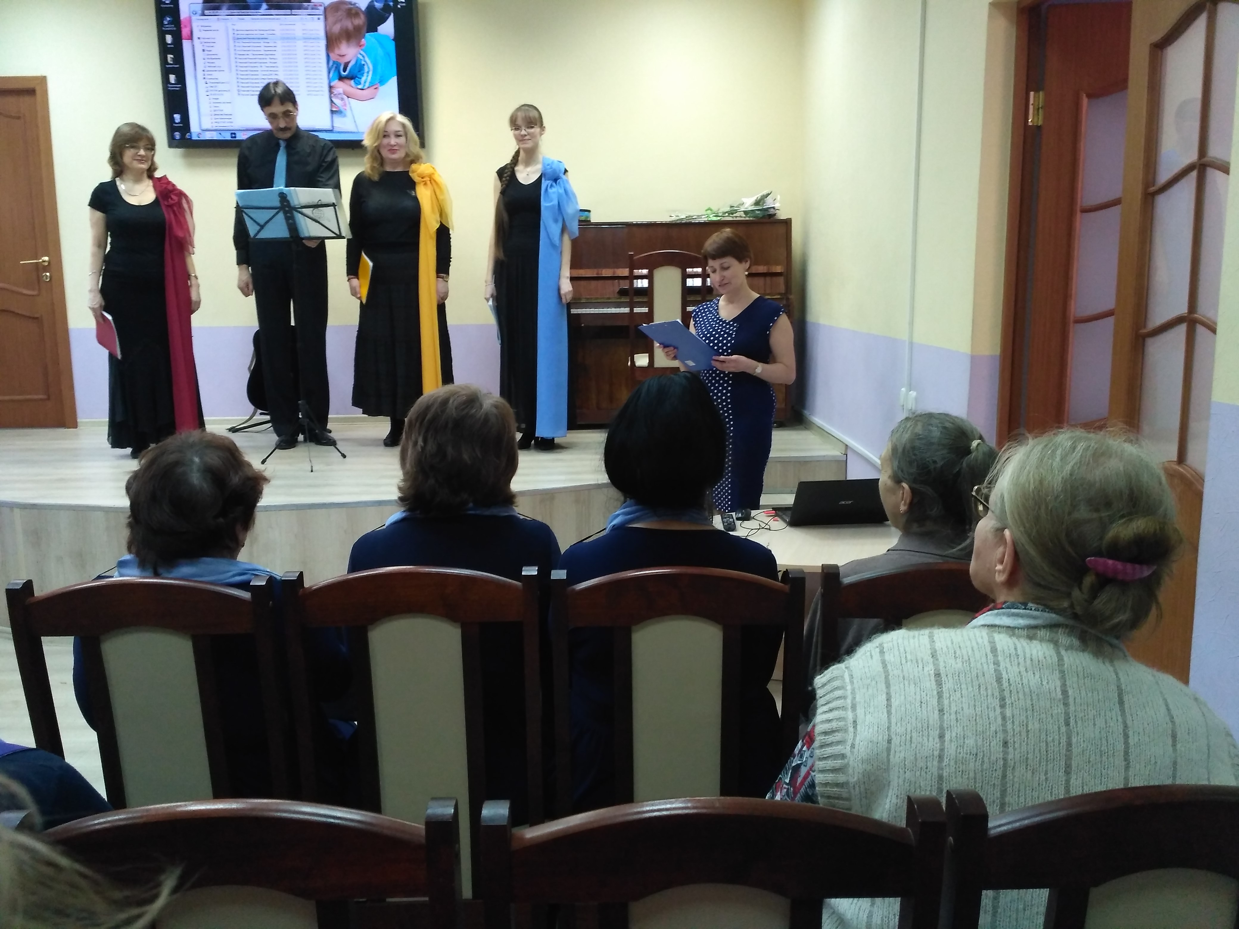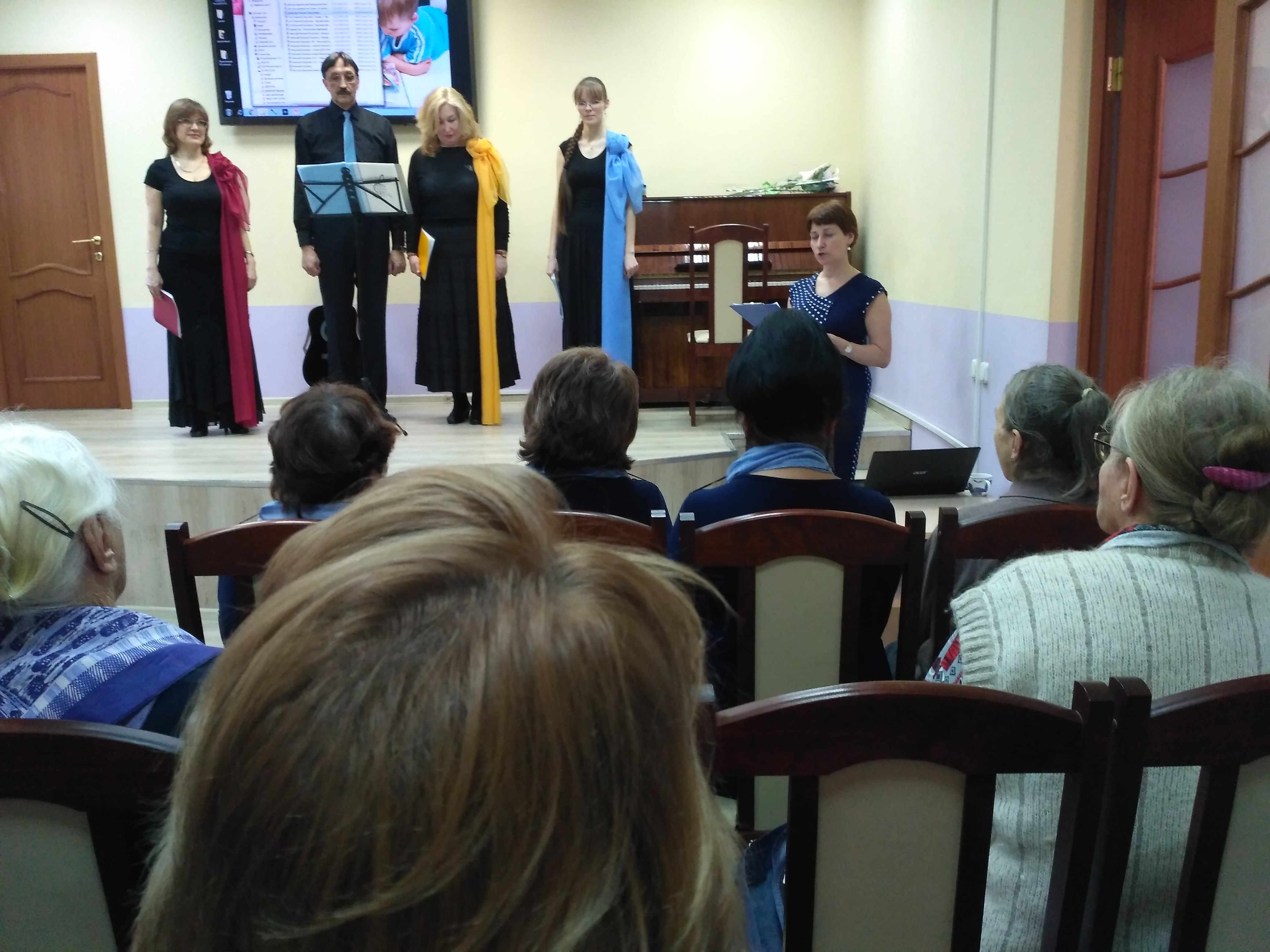 Вечер продолжился выступлением вокального ансамбля “Travellers”, образованного в 2012 г. из любителей хоровой музыки. Сегодня в составе ансамбля четыре человека разных профессий: адвокат Елена Борисовна Самолина, инженер Дмитрий Владимирович Пиценко, библиограф Наталья Викторовна Пиценко и преподаватель английского языка Ольга Дмитриевна Пиценко. В их исполнении прозвучали следующие композиции: «Три вещи», «Со вьюном я хожу», «Баркарола», «Ночь светла», «Выхожу один я на дорогу» и «Коль славен».