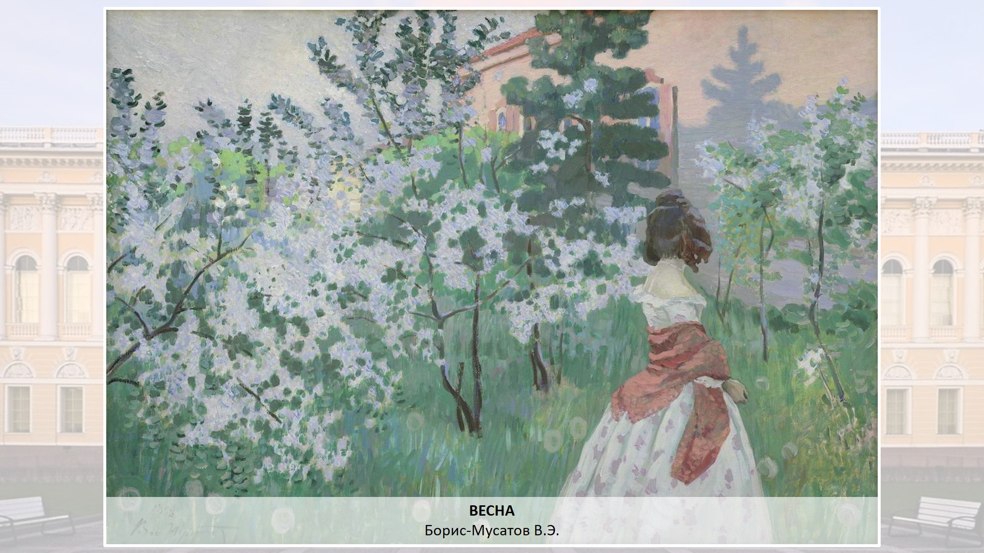 Тематикой экскурсий стала весна и ее отражение в живописи великих русских художников, представителей разных стилей и направлений: произведения тонкого лирика русского пейзажа А.К. Саврасов «Вид на Московский Кремль. Весна» и «Весенний вечер. Ольха цветет»; картина «Весна» признанного мастера символических изображений «дворянских гнезд» В. Э. Борисова-Мусатова; «Формула весны», принадлежащая кисти П.М. Филонова – выдающегося мастера русского искусства начала ХХ в. и одного из основоположников русского авангарда; картина «Весна» К.С. Петрова-Водкина, выполненная в разработанной им технике «сферической перспективы» или «живой видимости».