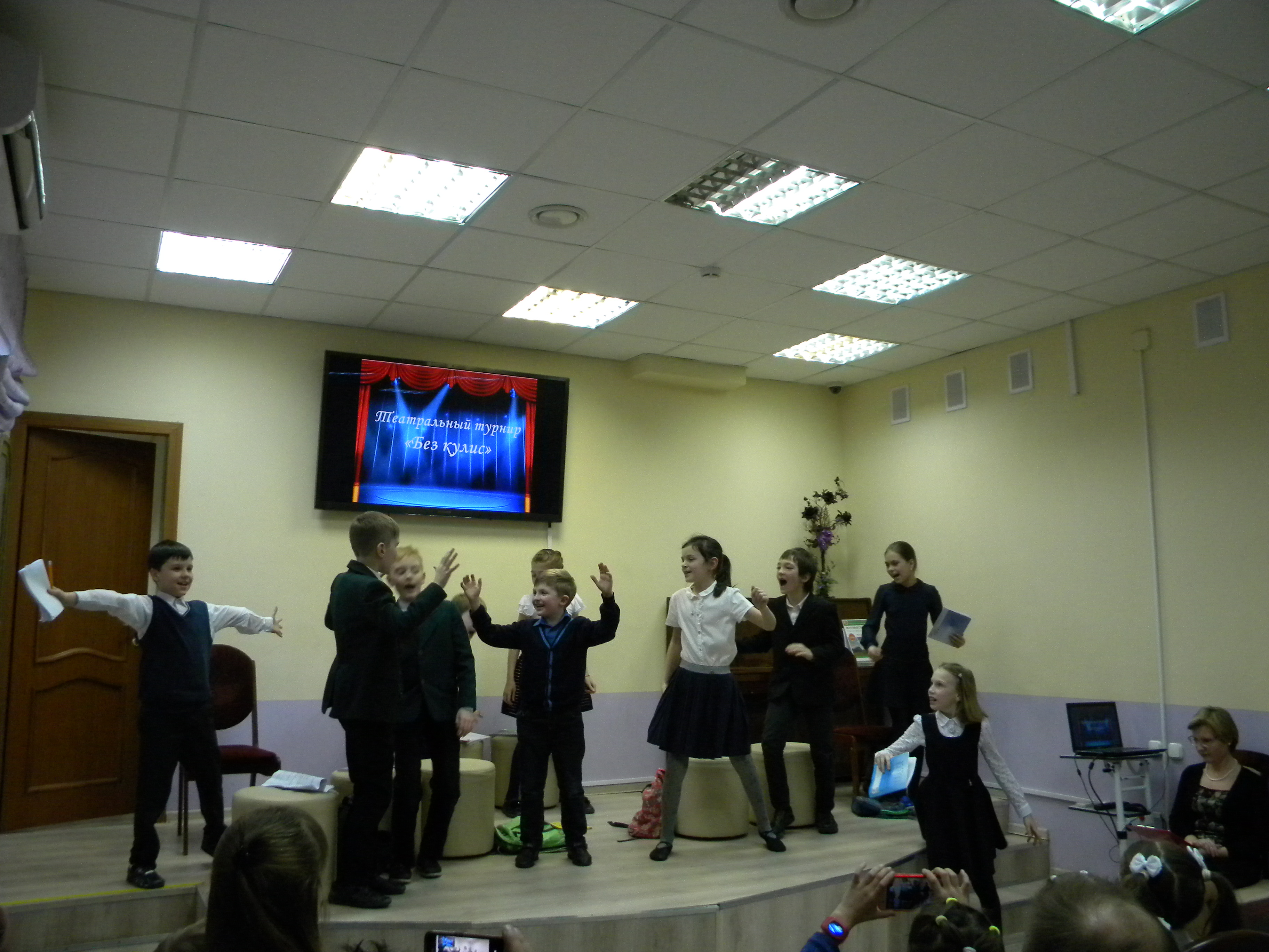 Затем праздник продолжился в литературной гостиной, где состоялся турнир «Без кулис», посвященный Году театра. Открытый поединок творческих коллективов разных поколений открыло выступление детской литературно-музыкальной студии «Озорная гамма» под руководством Ирины Александровны Ерасовой. Юные актеры представили постановку по произведению Надежды Тэффи «Переоценка ценностей».