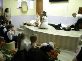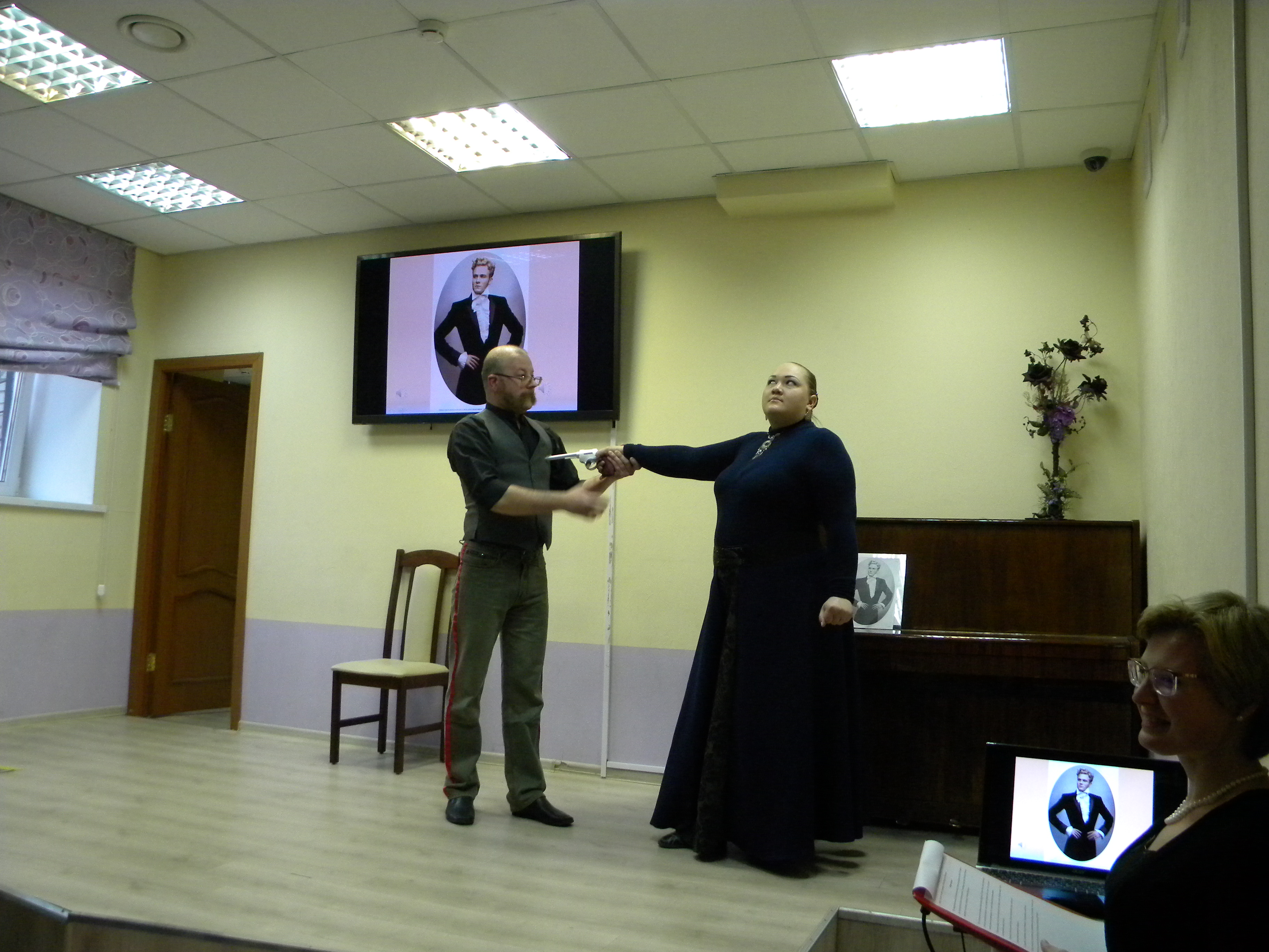 И в завершение встречи состоялось выступление театральной студии «Резонанс» под руководством Натальи Леонидовны Саломахиной. Участники коллектива представили вниманию зрителей юмористическую постановку по рассказу А. П. Чехова «Медведь».