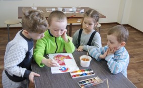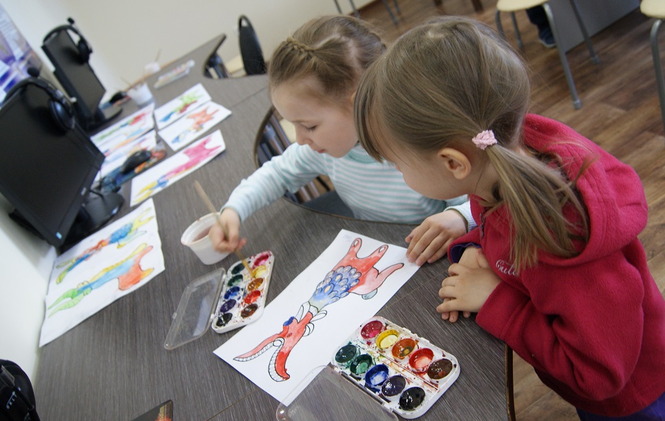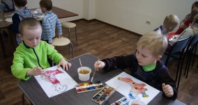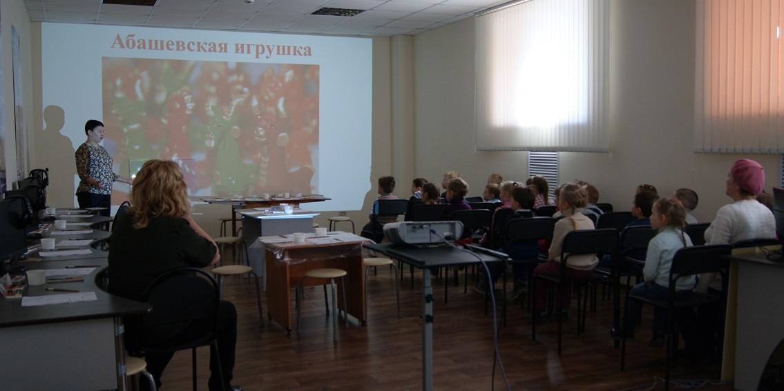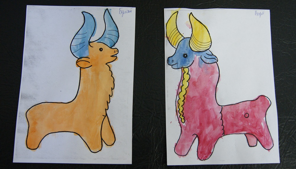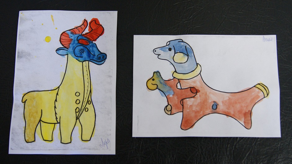 Сегодня они узнали об Абашевской игрушке. Начали эту игрушку делать в деревне Абашево Пензенской губернии в начале XX века. Первоначально это были свистульки, которые покрывали тёмно-зелёной или коричневой глазурью. Также окрашивали фигурки нескольким яркими цветами. Удивительные приземистые фигурки всадников, сливающихся с конём в одну фигуру, оленей, львов, петухов, уток, дам в шляпах всегда нравились людям. Позже игрушка становится немного другой – типаж сохранён, но сильнее утрирована массивность фигур, длинные шеи и мощные рога, короткие ноги. Появляются новые персонажи, например, Полкан, птица – бабочка. И покрывать их стали уже не глазурью, а эмалевыми красками. Зелёные, синие, красные, жёлтые, вишнёвые, оранжевые олени, козлы, бараны и коровы увенчанные, точно коронами, рогами разного силуэта, с круглыми дырками-глазами и ртами, конечно, не соответствуют представлениям о реальном облике этих животных, но нравятся всем. А золотые и серебряные блики в деталях превращают их в невероятных сказочных существ. Благодаря интерактивной программе Народное искусство из собрания Русского музея. Электронный путеводитель, каталог медиатеки виртуального филиала дети смогли внимательно рассмотреть как выглядит абашевская игрушка и сами стали раскрашивать бумажные заготовки, стараясь, чтобы получилось как у абашевских мастеров. Все ребятишки совершенно правильно раскрасили своих собак, коров, козлов и птиц, верно подобрали цвета.