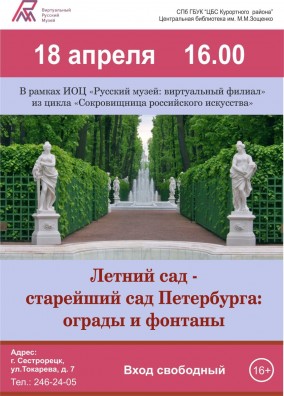 В рамках Информационно-образовательного центра «Русский музей: виртуальный филиал» 18 апреля в 16:00 в библиотеке прошла встреча «Летний сад – старейший сад Санкт-Петербурга: ограды и фонтаны».