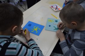 В апреле пройдут очередные занятия для воспитанников детских садов "Незабудка" и "Рябинка" начиная с 2 апреля. Всего эти занятия посещают дети 5 групп (старшие и выпускные группы). На восьмом занятии из программы "Мир чарующих красок" ребята продолжают знакомиться с жанровой живописью - на этот раз это "марина". С особенностями этого живописного жанра дети занкомятся на примере картины И.Айвазовского "Девятый вал". В заключении занятия каждый делает самостоятельную работу - картину с изображением морских обитателей.