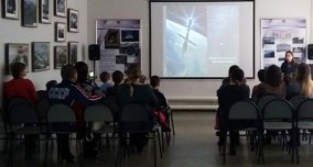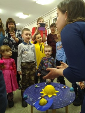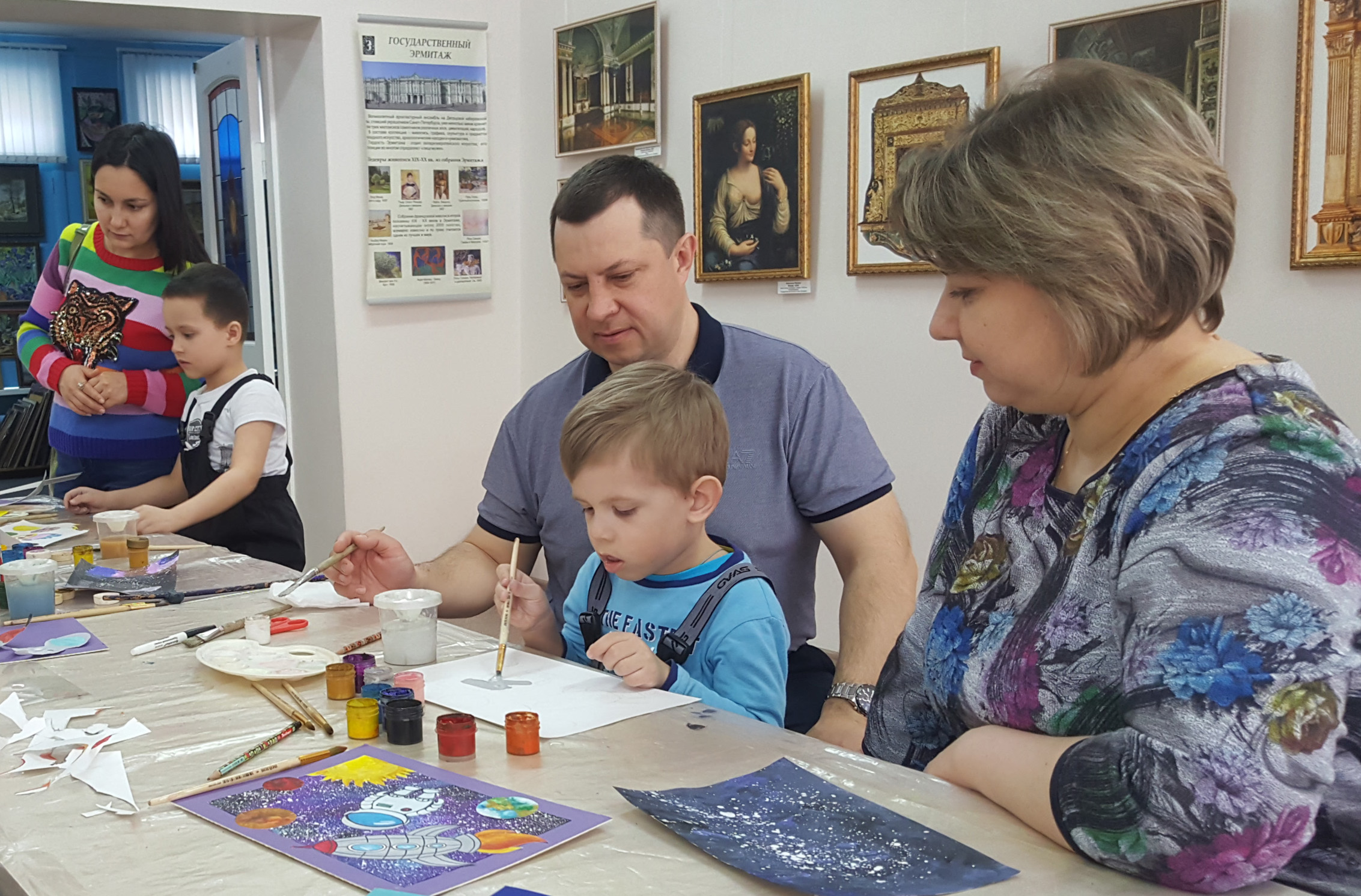 В преддверии Дня космонавтики семейные посетители Виртуального филиала Русского музея в КВЦ "Радуга" отправились в космическое путешествие по картинам Андрея Соколова, Андрея Плотнова и Алексея Леонова. Мальчики и девочки увидели космические корабли, обозревали просторы Вселенной, познакомились с Солнечной системой и сравнили размеры ее планет.