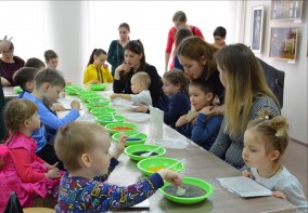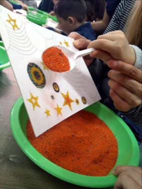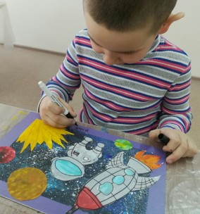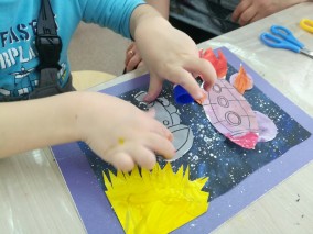 А в творческой мастерской каждый смог представить свой полет к далеким галактикам: сияет космическая пыль, горят звезды и вращаются песчаные планеты, а через акварельный космос, полный брызг и звезд, летит отважный космонавт!..