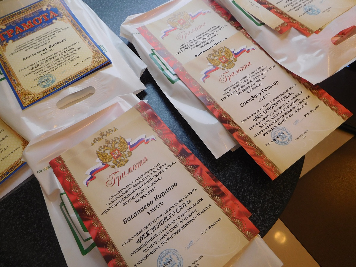 Жюри конкурса – художники, искусствоведы и библиотекари, подводя итоги, отметили макет Летнего сада, созданный ребятами из ГДОУ № 117, фотоколлаж «В Летнем саду» ребят из ГДОУ № 63, изумительные фотографии юных фей Серегиной Кристины и Кузнецовой Софии.