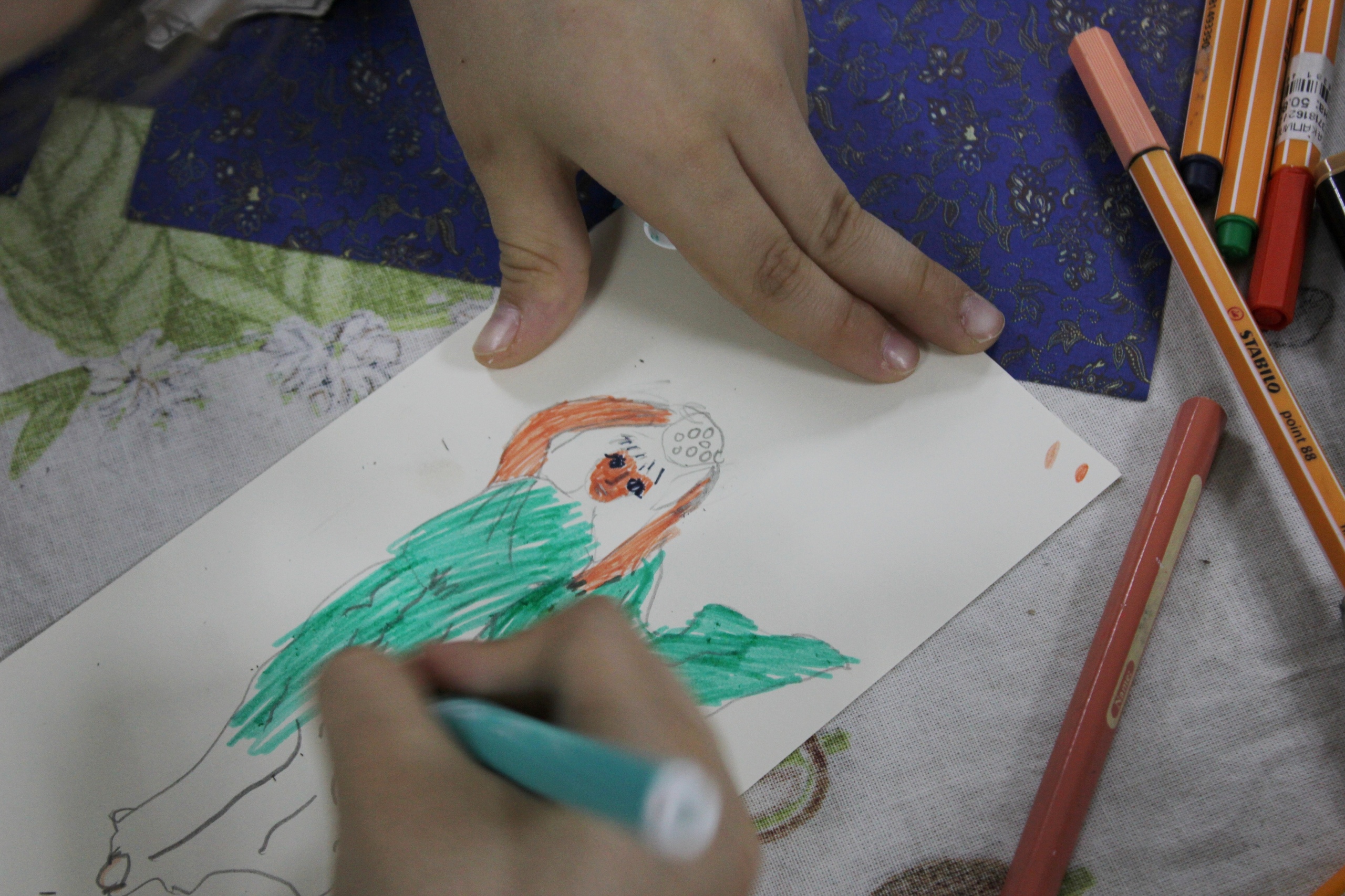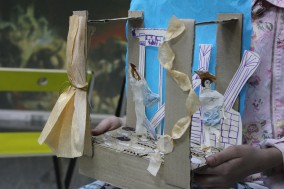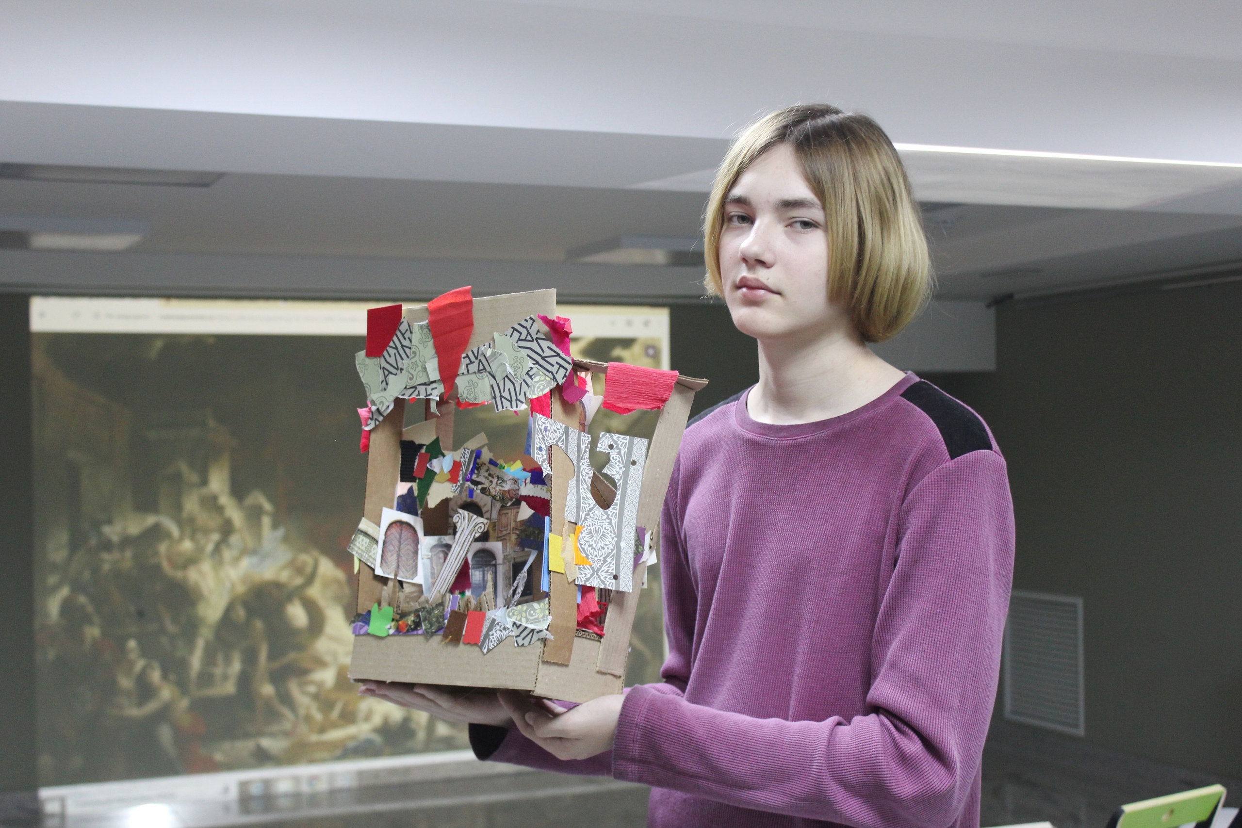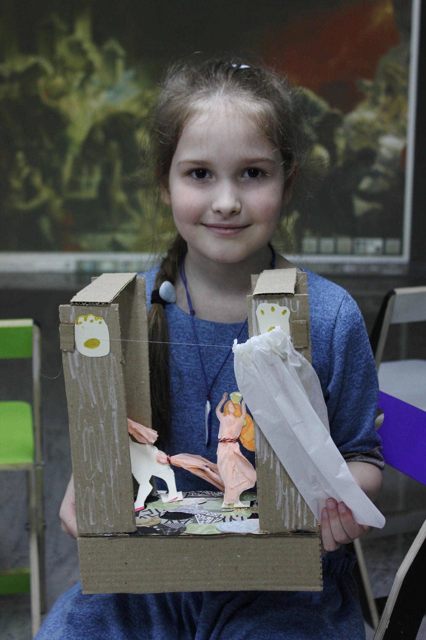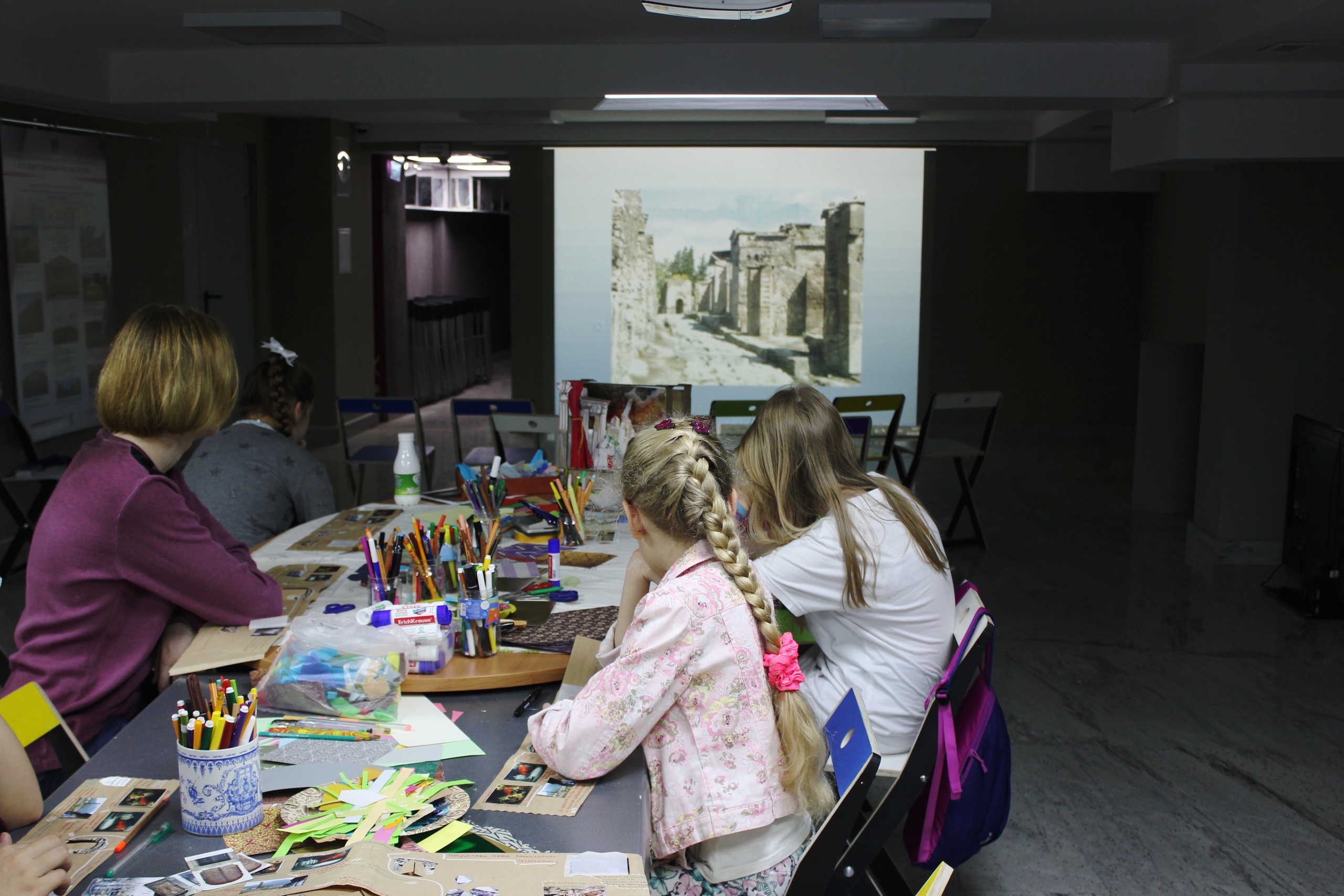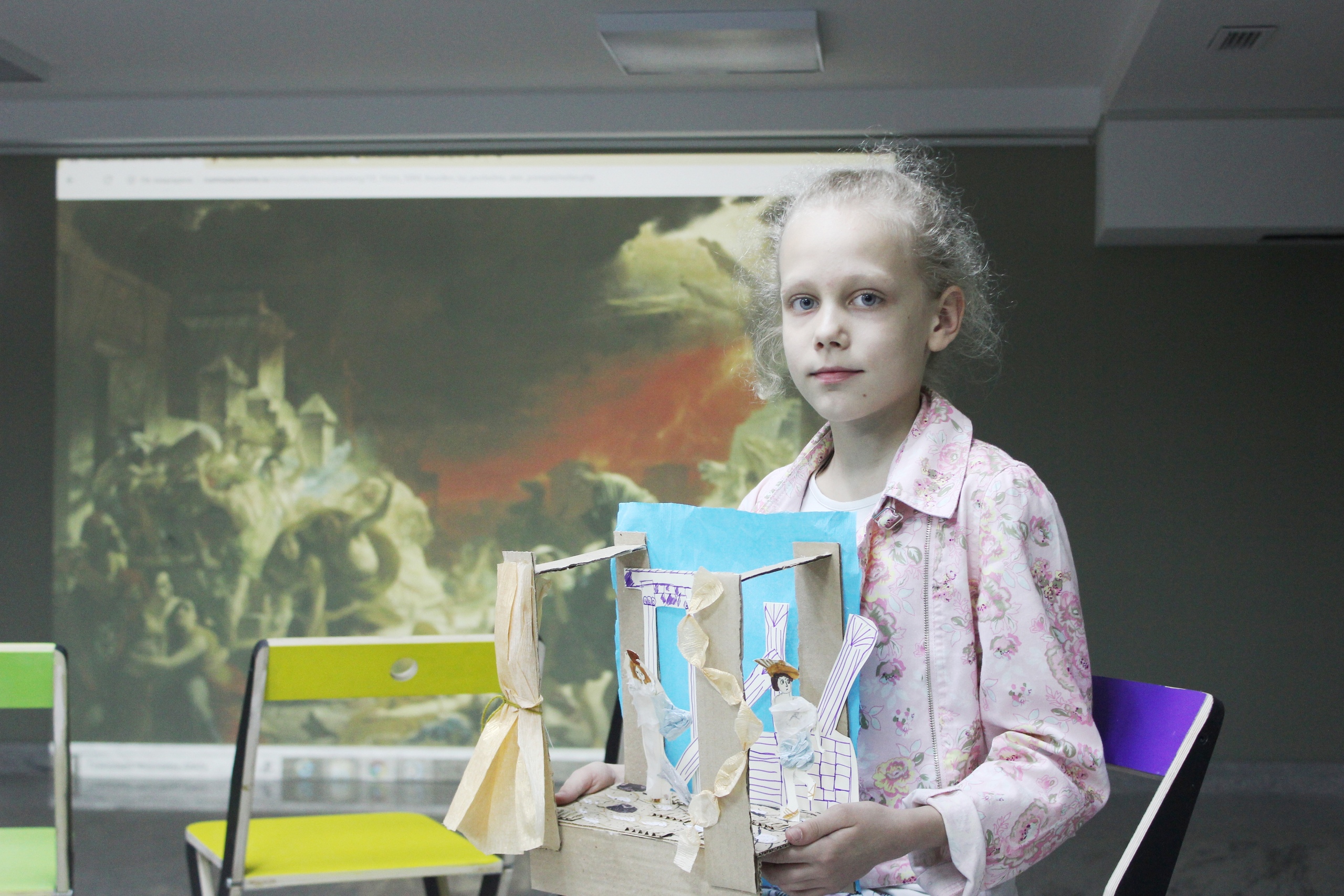 На мастер-классе ребята создавали объёмный макет сцены с персонажами и декорациями. А младшая группа ещё успела заполнить карту археологических раскопок и поиграть с помощью программ медиатеки, выстраивая освещение картины.