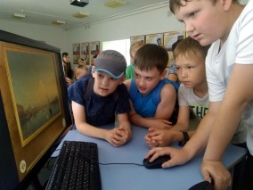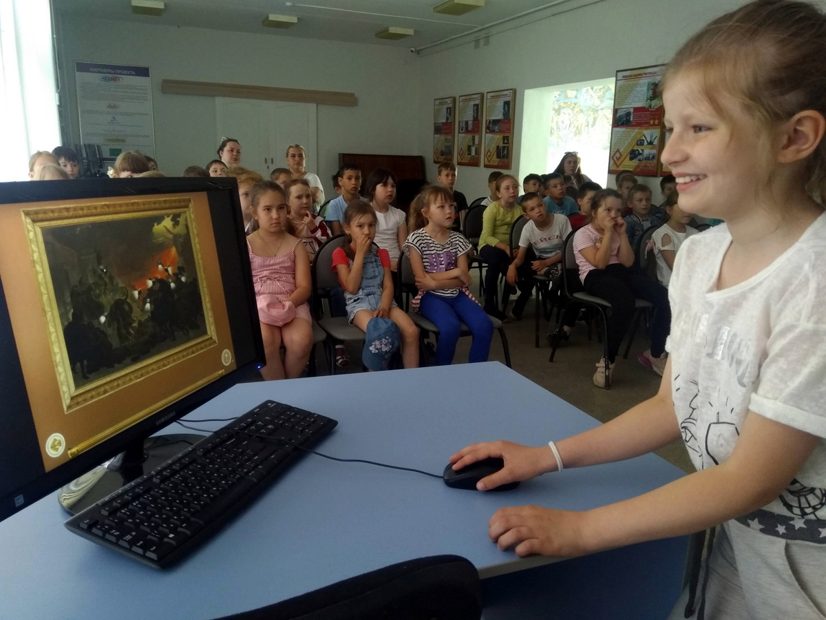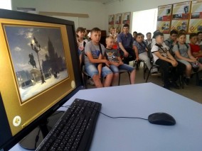Не покидая Чебоксар, мальчики и девочки отправились в Санкт-Петербург, на Царицын луг и совершили 3D-погружение в полотно Григория Чернецова. На этом масштабном групповом портрете, где изображены почти 300 человек, ребята, пользуясь интерактивной программой по картине Г.Чернецова, смогли отыскать именинника — Александра Сергеевича Пушкина.