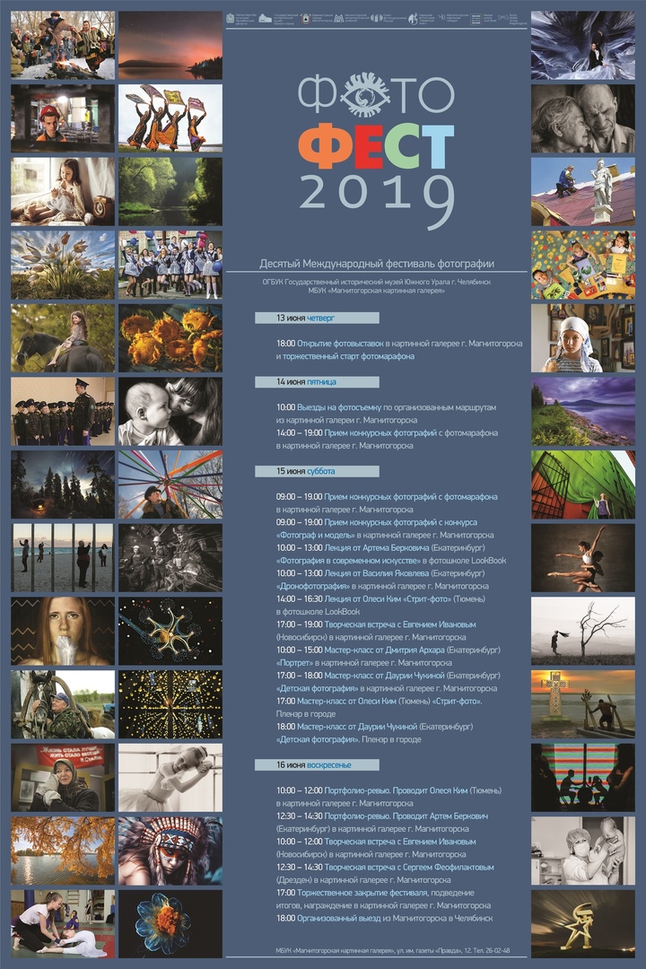 Международный фестиваль "Фотофест" вот уже десятый год подряд собирает фотографов с Урала, из России и со всего мира. Десятый юбилейный «Фотофест 2019» состоялся при поддержке Правительства Челябинской области и областного министерства культуры. Он открлся 13 июня в Государственном историческом музее Южного Урала. Затем участники фестиваля отправились в Магнитку, где с 13 по 16 июня прошел фотомарафон "Один день из жизни Магнитогорска". Выбор организаторов фотомарафона пал на этот город не случайно — в 2019 году Магнитогорск отмечает свое 90-летие. Магнитогорская картинная галерея приняла в своих стенах не только участников фестиваля, но и замечательную фотовыставку.