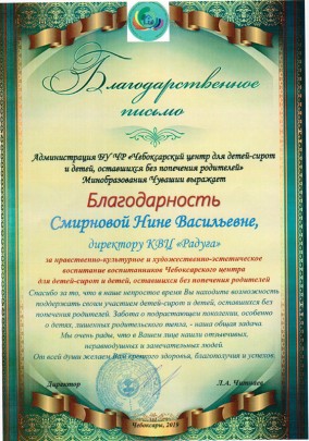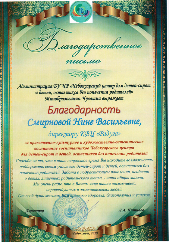В адрес директора Культурно-выставочного центра «Радуга» Нины Смирновой поступило благодарственное письмо от Администрации БУ ЧР «Чебоксарский центр для детей-сирот и детей, оставшихся без попечения родителей» Министерства образования и молодежной политики Чувашской Республики: «Спасибо за то, что в наше непростое время Вы находите возможность поддержать своим участием детей-сирот и детей, оставшихся без попечения родителей. Забота о подрастающем поколении, особенно о детях, лишенных родительского тепла, — наша общая задача. Мы очень рады, что в Вашем лице нашли отзывчивых, неравнодушных и замечательных людей. От всей души желаем Вам крепкого здоровья, благополучия и успехов».