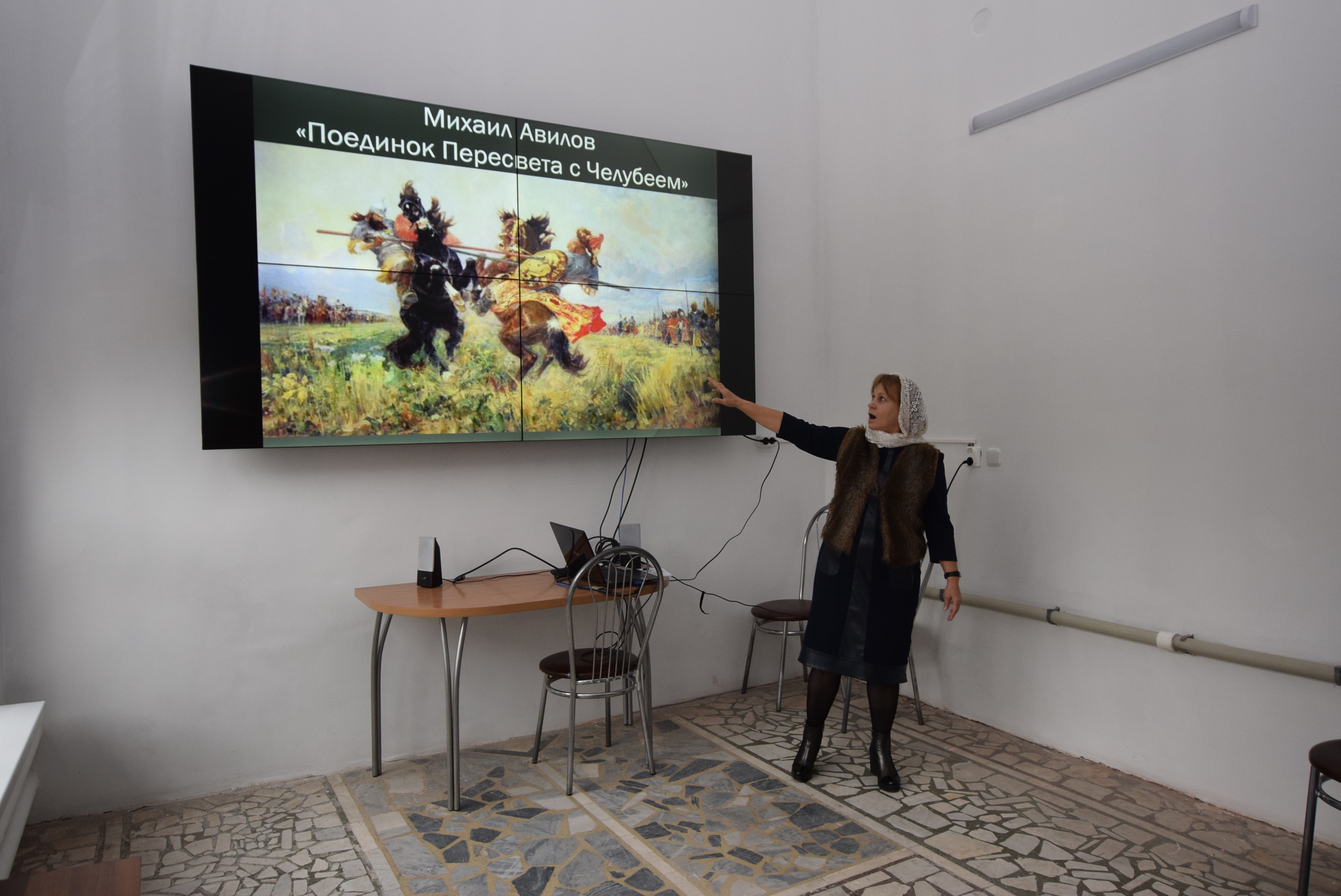 Различные эпизоды Куликовской битвы ребята вспоминали, опираясь на картины русских художников: «Благословение Сергием Радонежским Дмитрия Донского» Михаила Нестерова, «Утро на Куликовом поле» Александра Бубнова, «Бой Пересвета с Челубеем» Михаила Авилова, «Дмитрий Донской на Куликовом поле» Ореста Кипренского, «Молитва Пересвета» и «Куликовская битва» Павла Рыженко, «Засадный полк» Ильи Глазунова, «Дмитрий Донской на Куликовом поле» Василия Сазонова. Школьники рассмотрели макет архитектурно-художественного комплекса «Государственный Русский музей», где в Академическом зале Михайловского дворца можно увидеть полотна О.Кипренского и В. Сазонова.