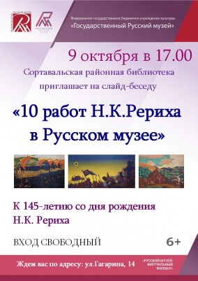 9 октября в Сортавальской районной библиотеке прошла слайд–беседа «10 работ Н.К. Рериха в Русском музее». Беседа была приурочена к 145–летию со дня рождения художника.