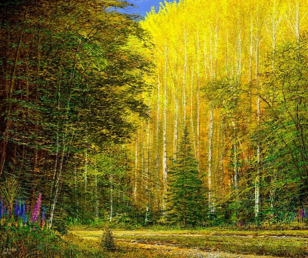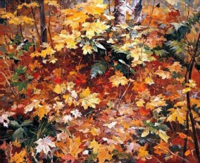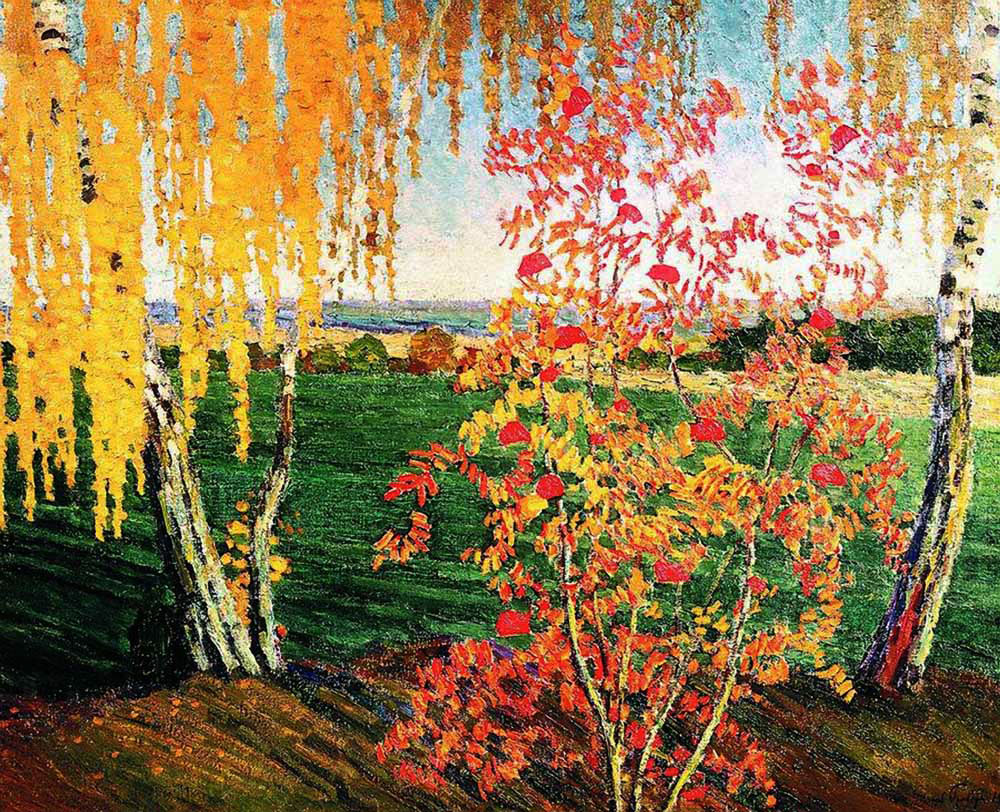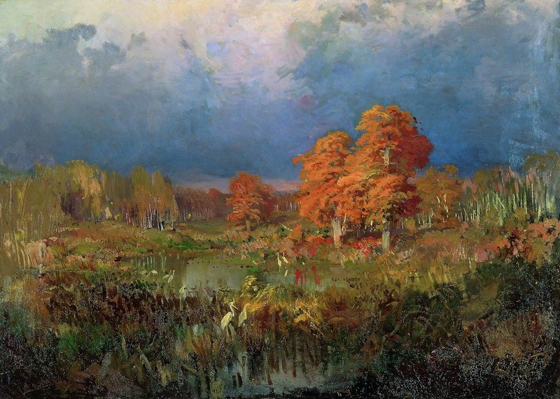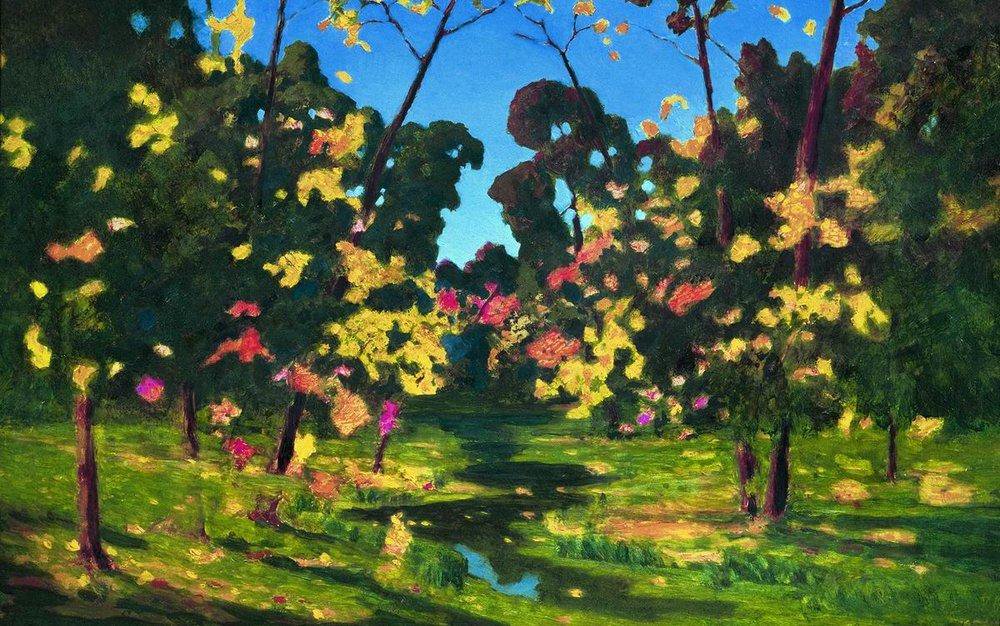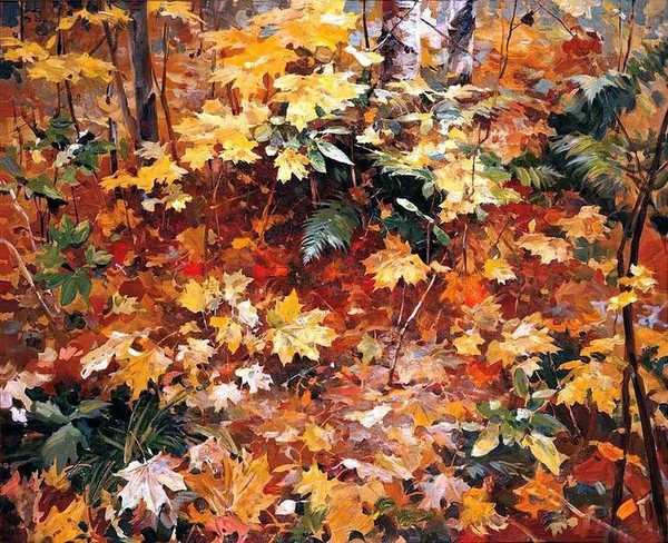На занятии с созвучным осени названием «Лес, точно терем расписной» с учениками ШДТ «Занимайка» любовались полотнами И.И.Левитана, Ф.А.Васильева, И.С.Остроухова, А.Я.Головина и осенними пейзажами других русских художников. Фантазировали и размышляли над картиной А.И.Куинджи «Осень». Легкий ветерок подхватил оранжевые листья, закружил их в осеннем хороводе, и эти узоры заметил художник! Кажется, уже и не листья танцуют над ручьем, а огненные птицы и золотые рыбки,- в силуэтах кружащихся листьев угадываются новые и новые образы.