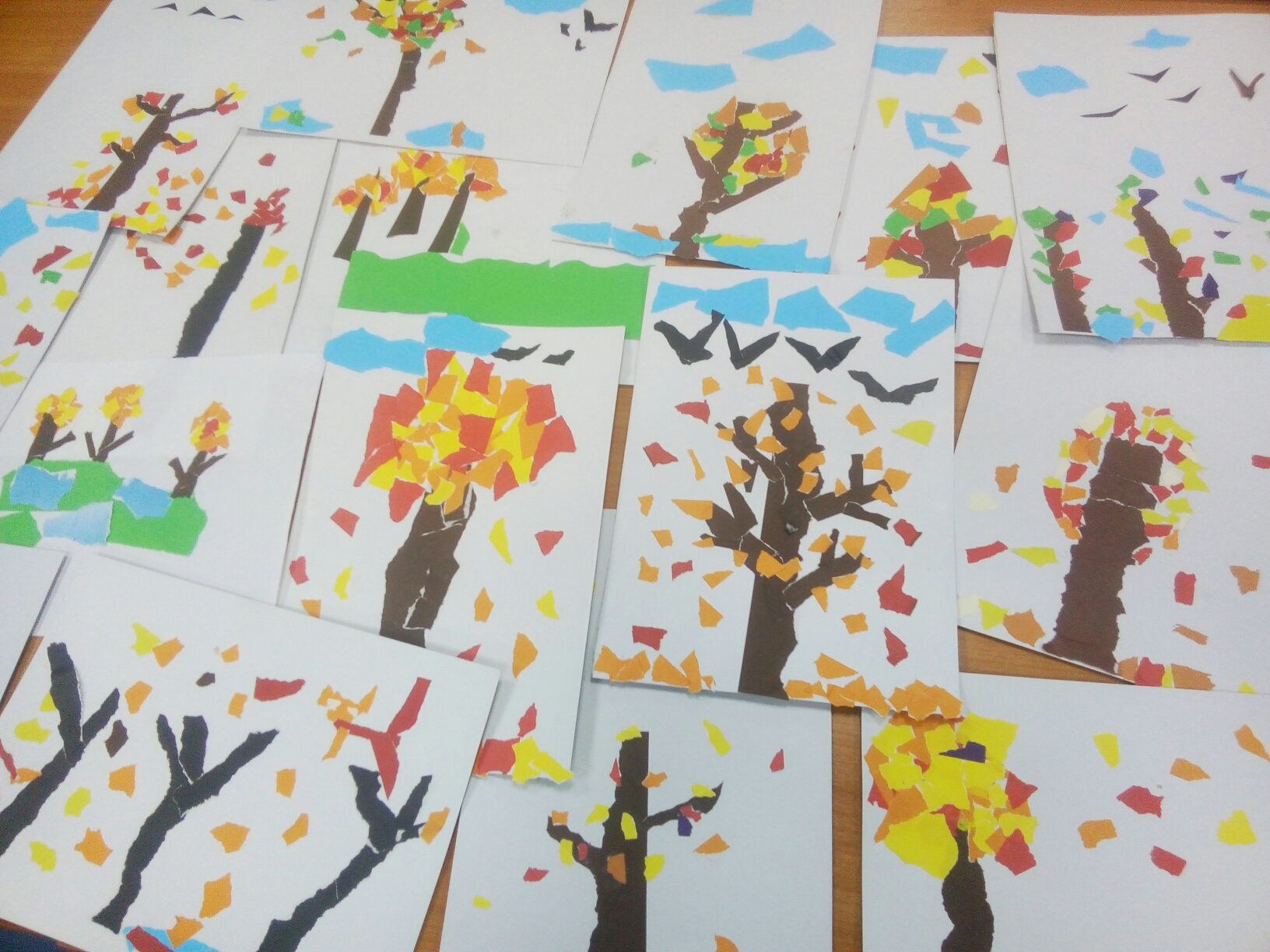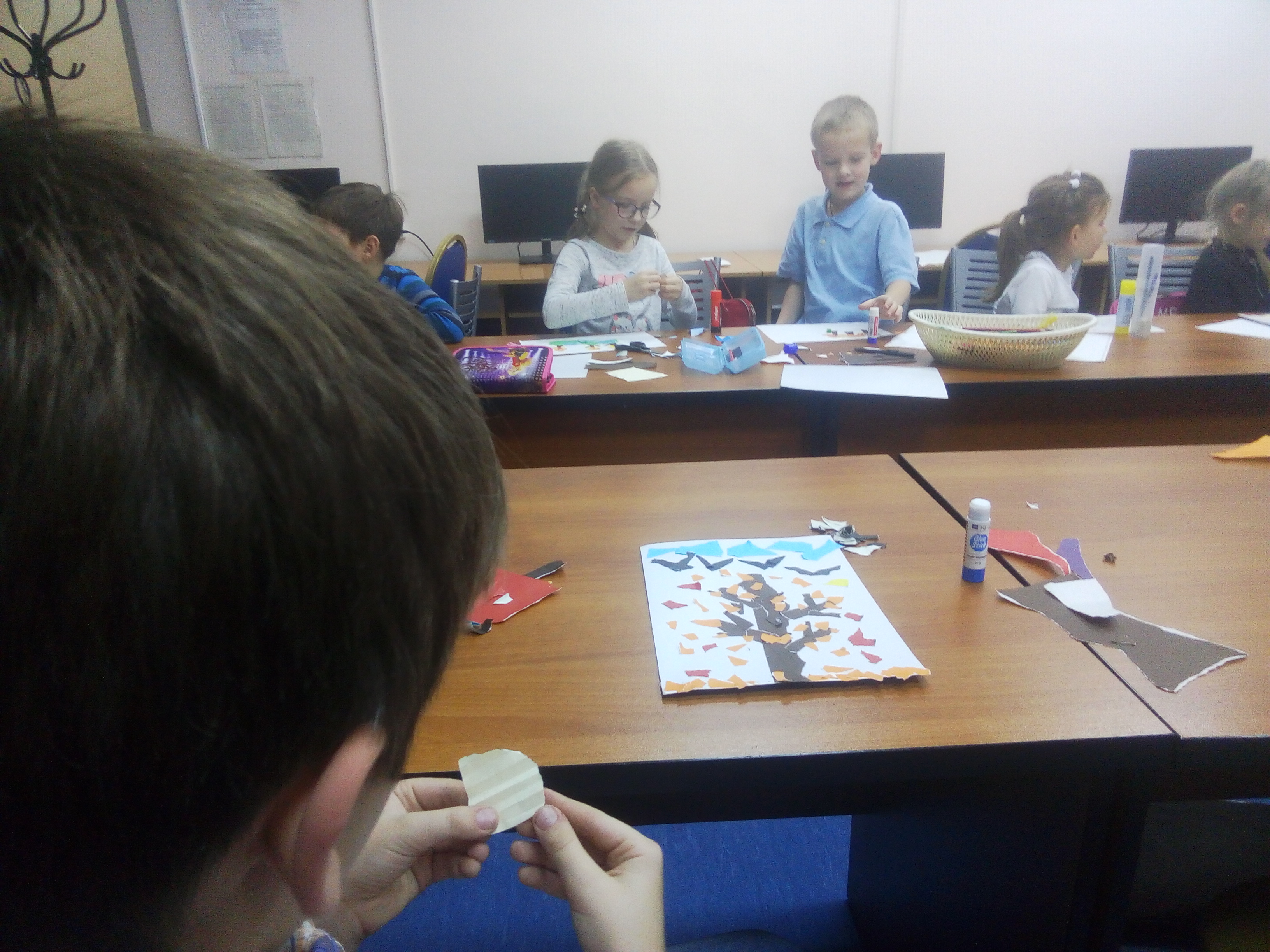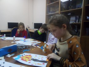 С ребятами-актерами из театральной студии «Люди и куклы» вместе удивлялись ярким краскам осени в пейзажах русских художников, на примере картины И.Э.Грабаря «Рябинка», рассуждали о разнообразии форм листьев, крон деревьев, изяществе осенних гирлянд, и, вдохновившись осенними пейзажами, создали свои осенние творческие работы в технике отрывной аппликации.