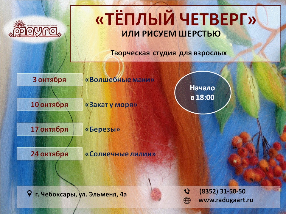 Каждый четверг в удобное вечернее время Вас ждут творческие мастерские в различных техниках.